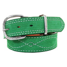 Premium Grass Green suede leather lined in Herman Oak saddle skirting leather, stitched in white thread with our classic Gunslinger pattern! Straight 1 1/2” belt.
