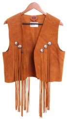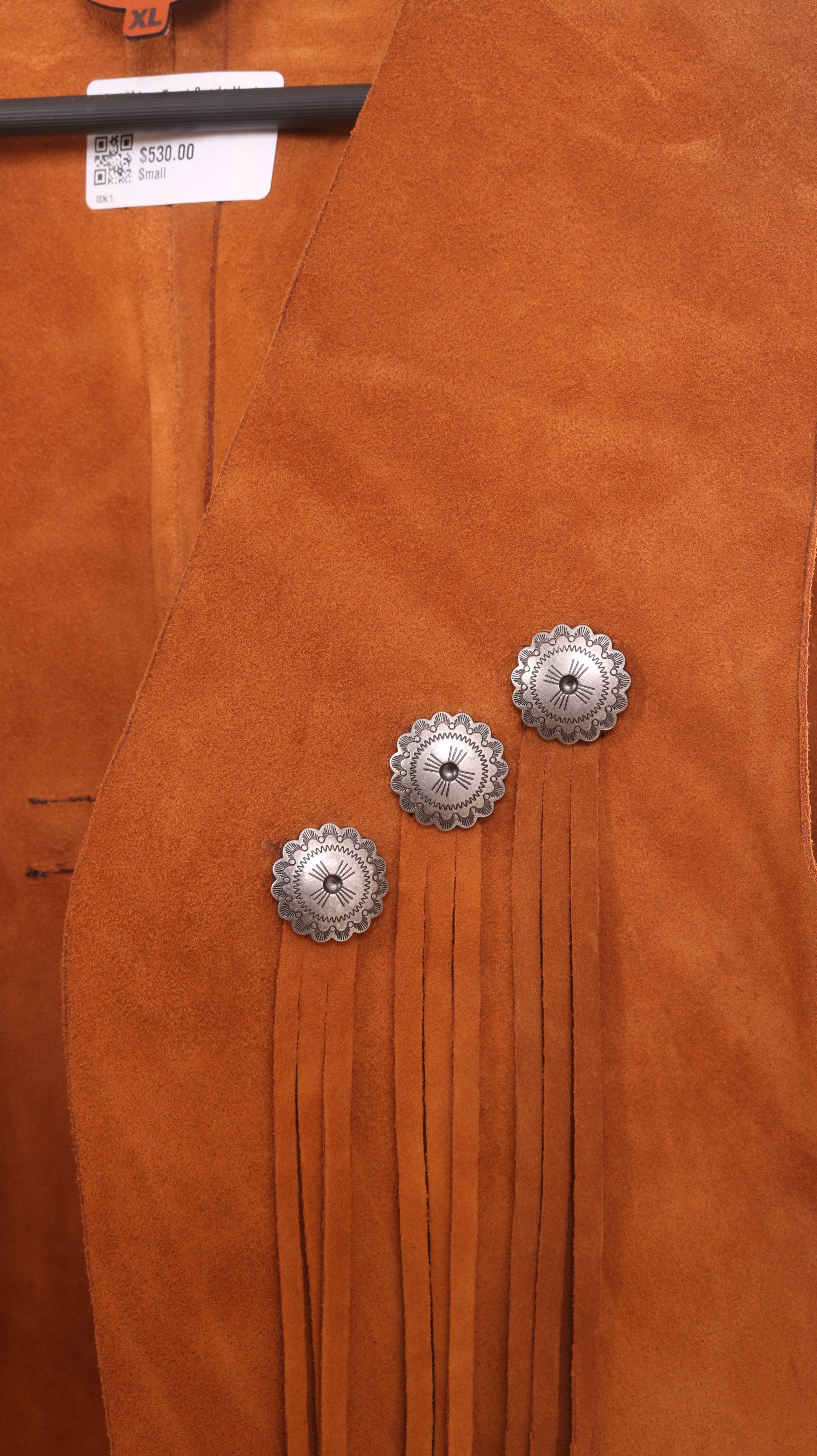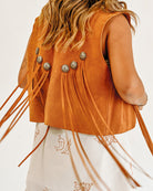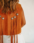 Turn heads and embrace timeless Western style with the Double J Fringe Suede Vest in Toast Suede color. Crafted from premium genuine suede, this standout piece features long, dramatic fringe detailing on the front and back. With custom silver-tone conchos that add an authentic Western touch