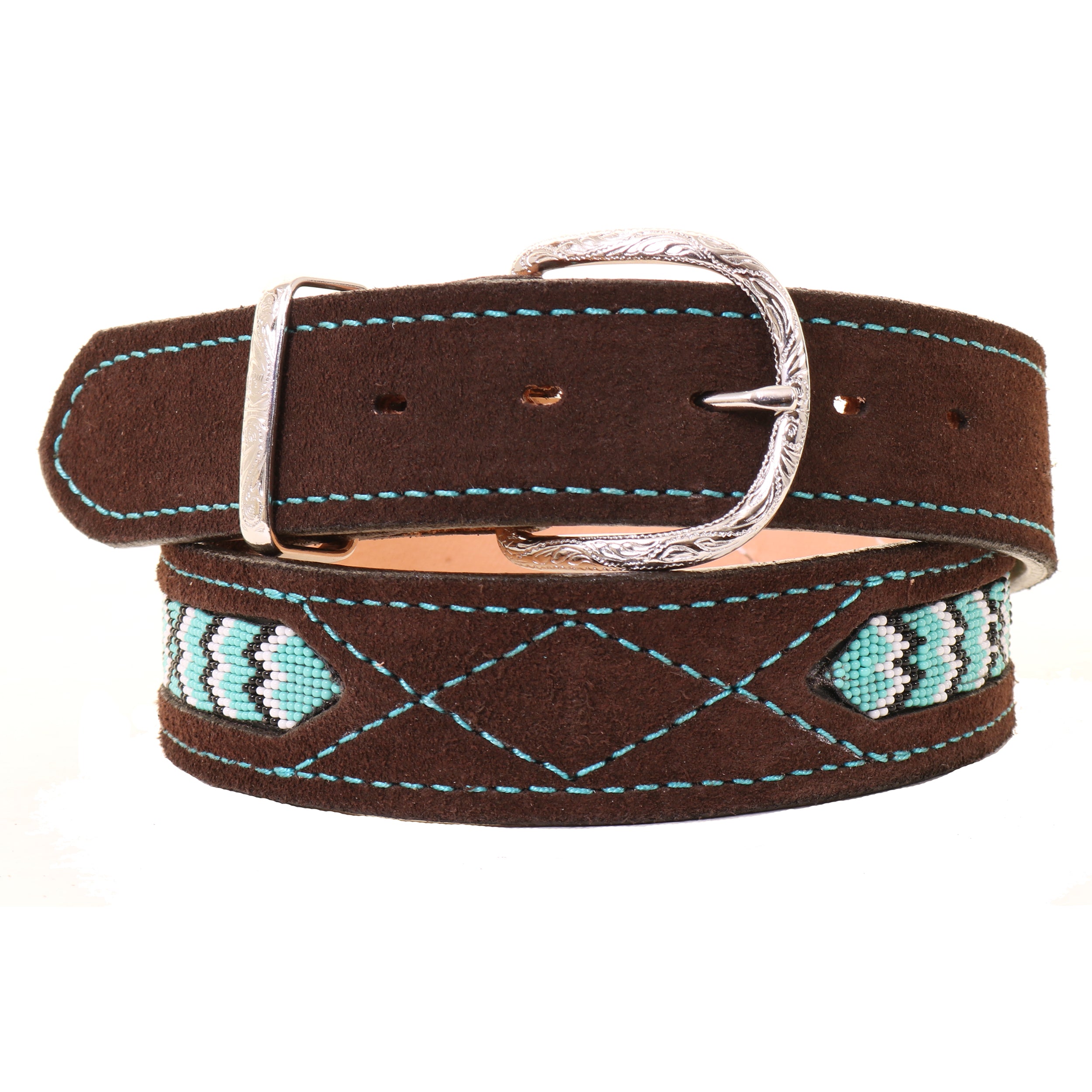 Make a statement without saying a word. This brown suede belt features classic gunslinger stitching paired with bold turquoise beaded accents. Crafted from soft, premium suede, the belt adds texture and depth while the intricate stitching brings character. This belt is designed for those who appreciate craftsmanship with attitude.