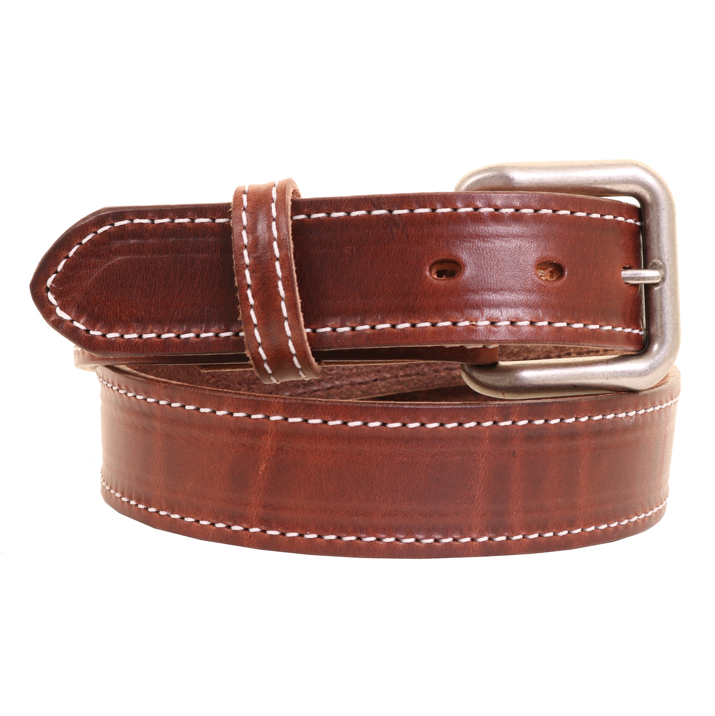 1-1/2" brown harness leather belt with single row white stitching along the edges and a silver buckle