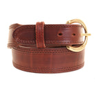 1-7/8" tapered to 1-1/2" brown harness leather belt with brown stitching and a brass buckle