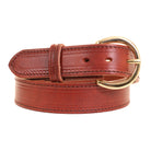 1-1/2" harness leather belt in cognac with brown single row brown stitching and a brass buckle