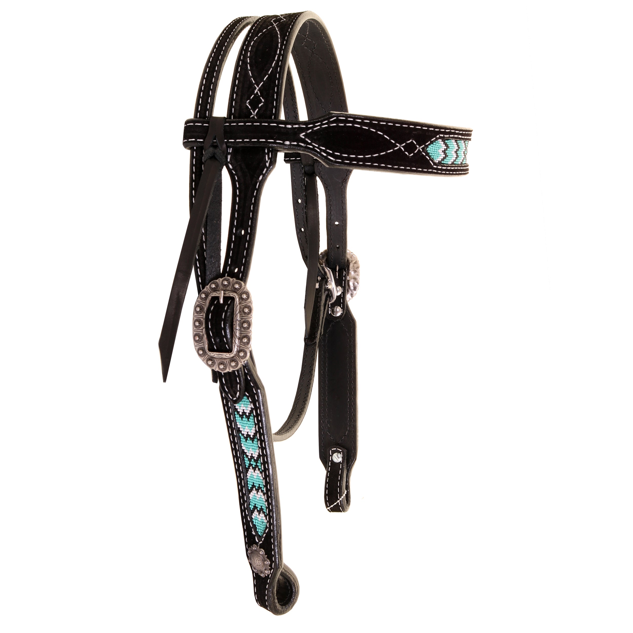 Black suede browband with gunslinger stitching, beaded inlays, antique silver berry buckles, and antique silver berry conchos.