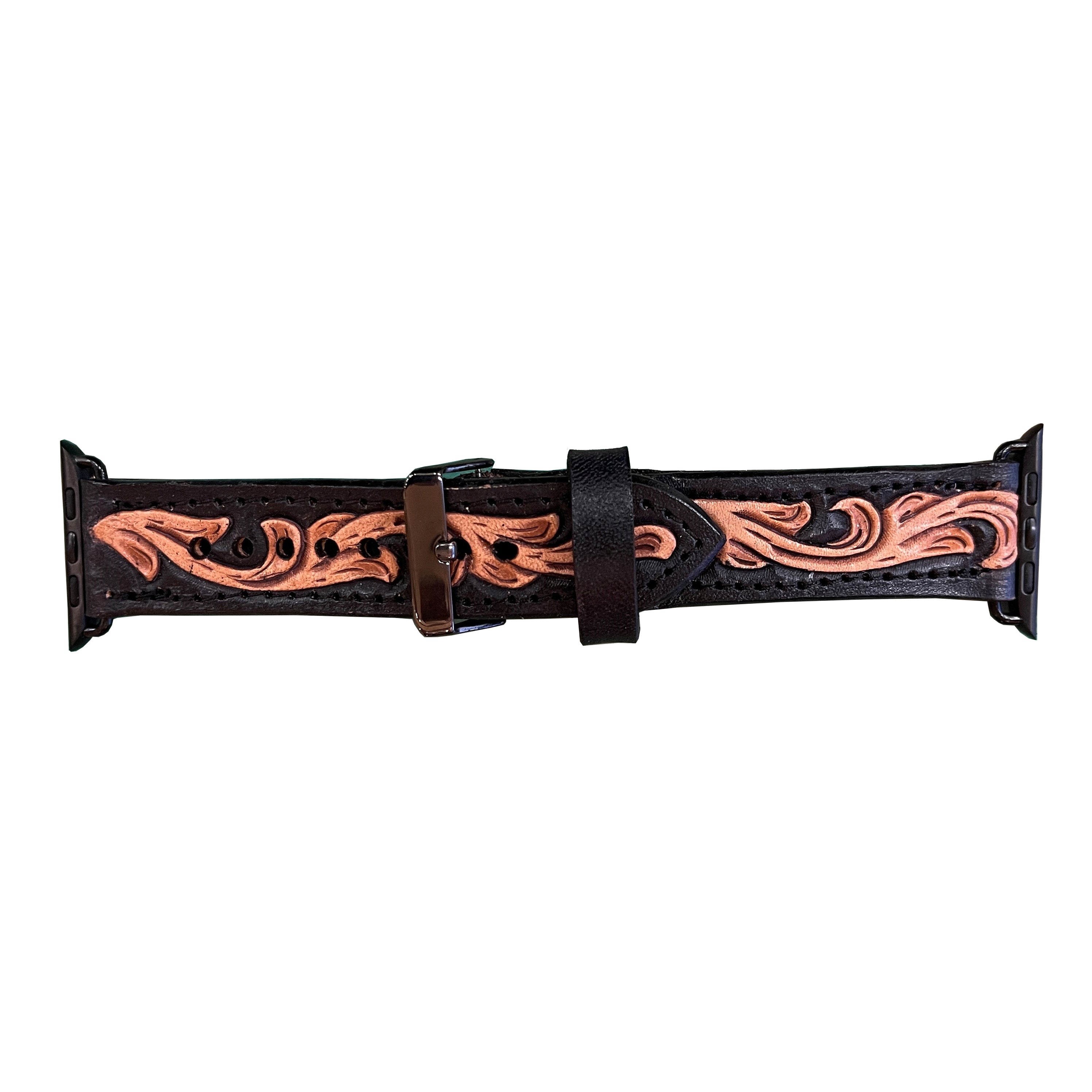 Apple watch band with natural floral tooling and black background.