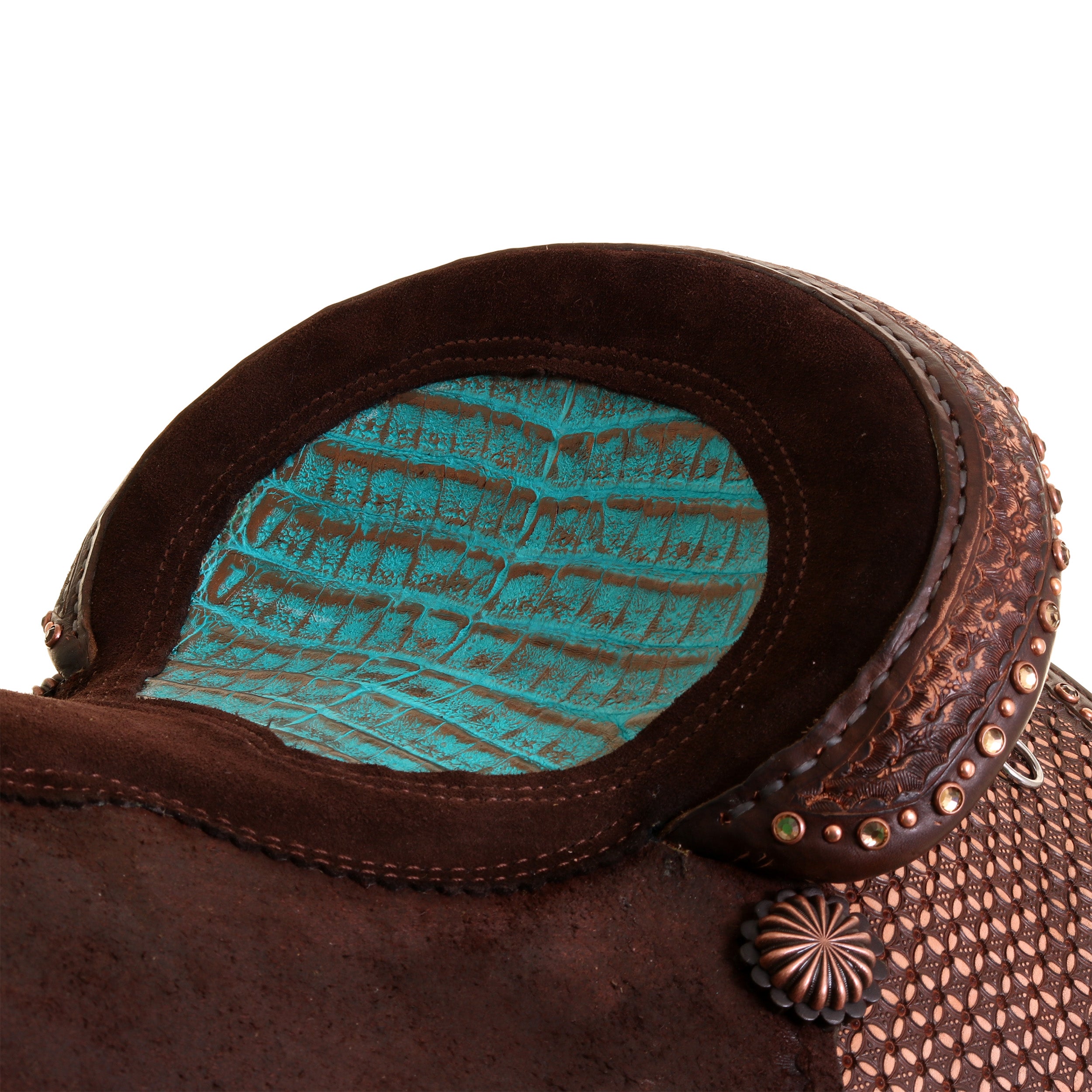 Seat & Color: Bicycle in Chocolate Suede With Gold/Turquoise Caiman Inlay
