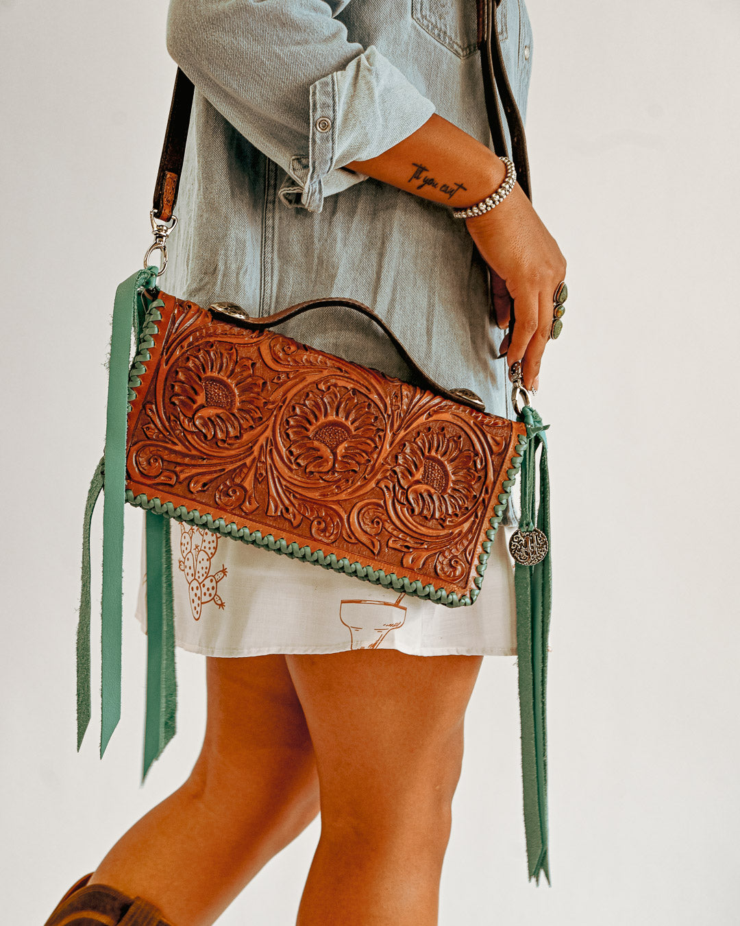 Elevate your style with this beautifully crafted folding clutch, hand-tooled on both sides with a sunflower design. Featuring turquoise whipstitching along the edges and matching turquoise saddle strings, it combines classic western craftsmanship with practical functionality. The interior includes two magnetic snaps and two zippered pockets, while a vintage pecan tooled handle with silver hammered conchos and a detachable long adjustable strap offer versatile carrying options