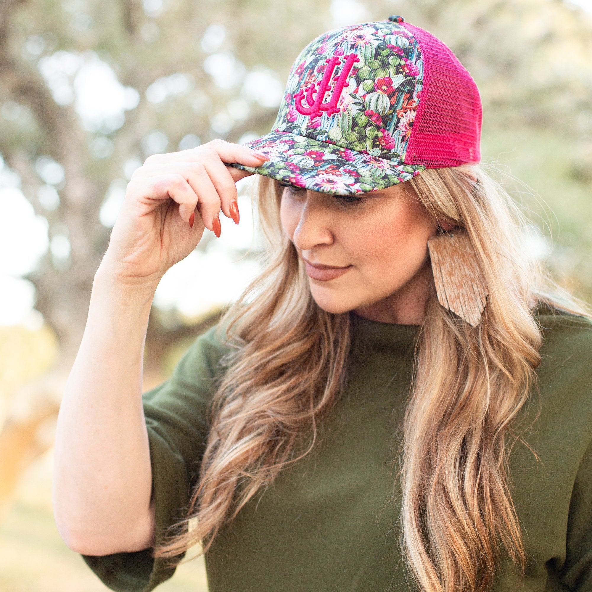 Cactus and flower Double J Cap with pink mesh back and logo.