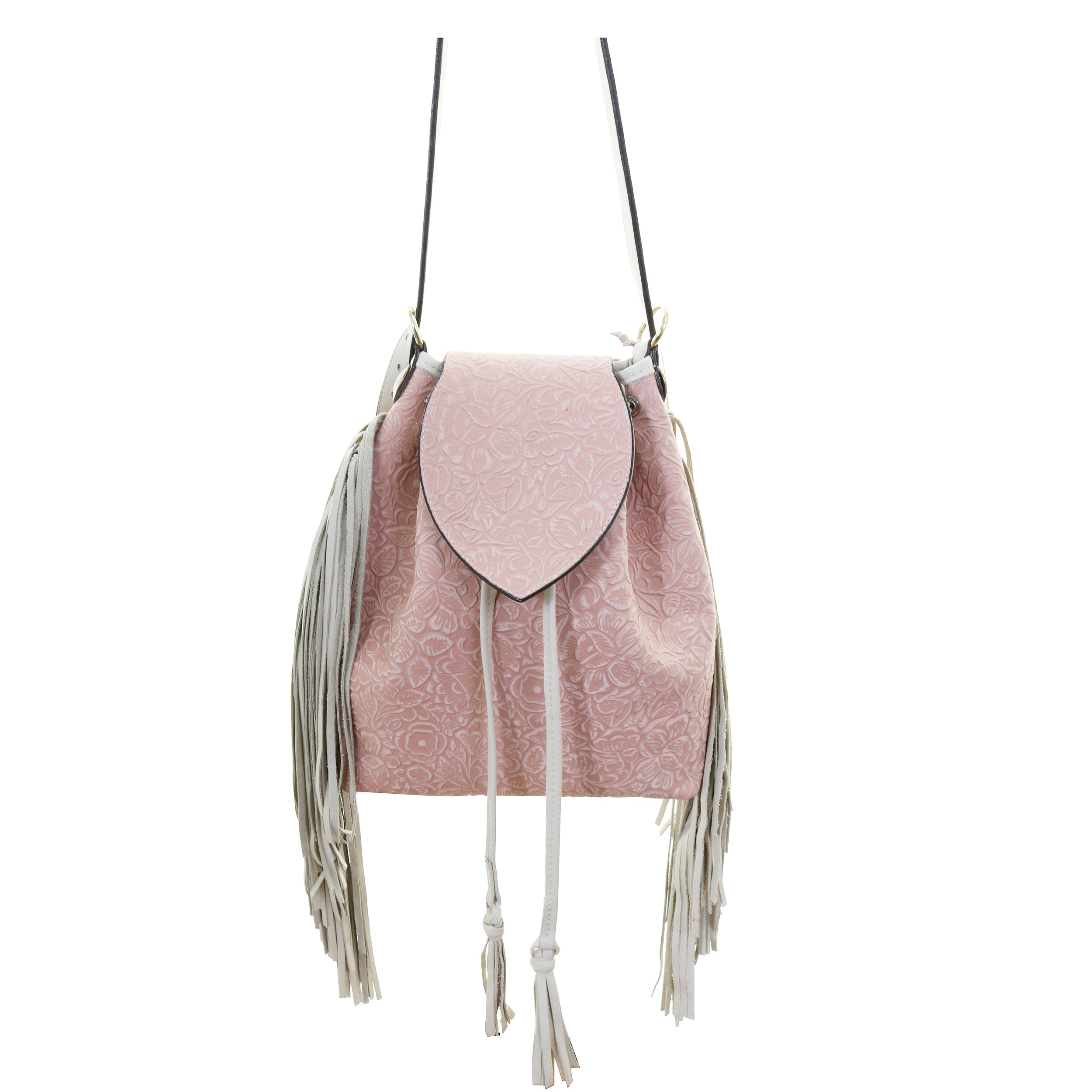 Blushing Roses Big Backpack on front, back & flap. Eggshell doyal bottom, drawstrings, XL fringe, & crossover strap.