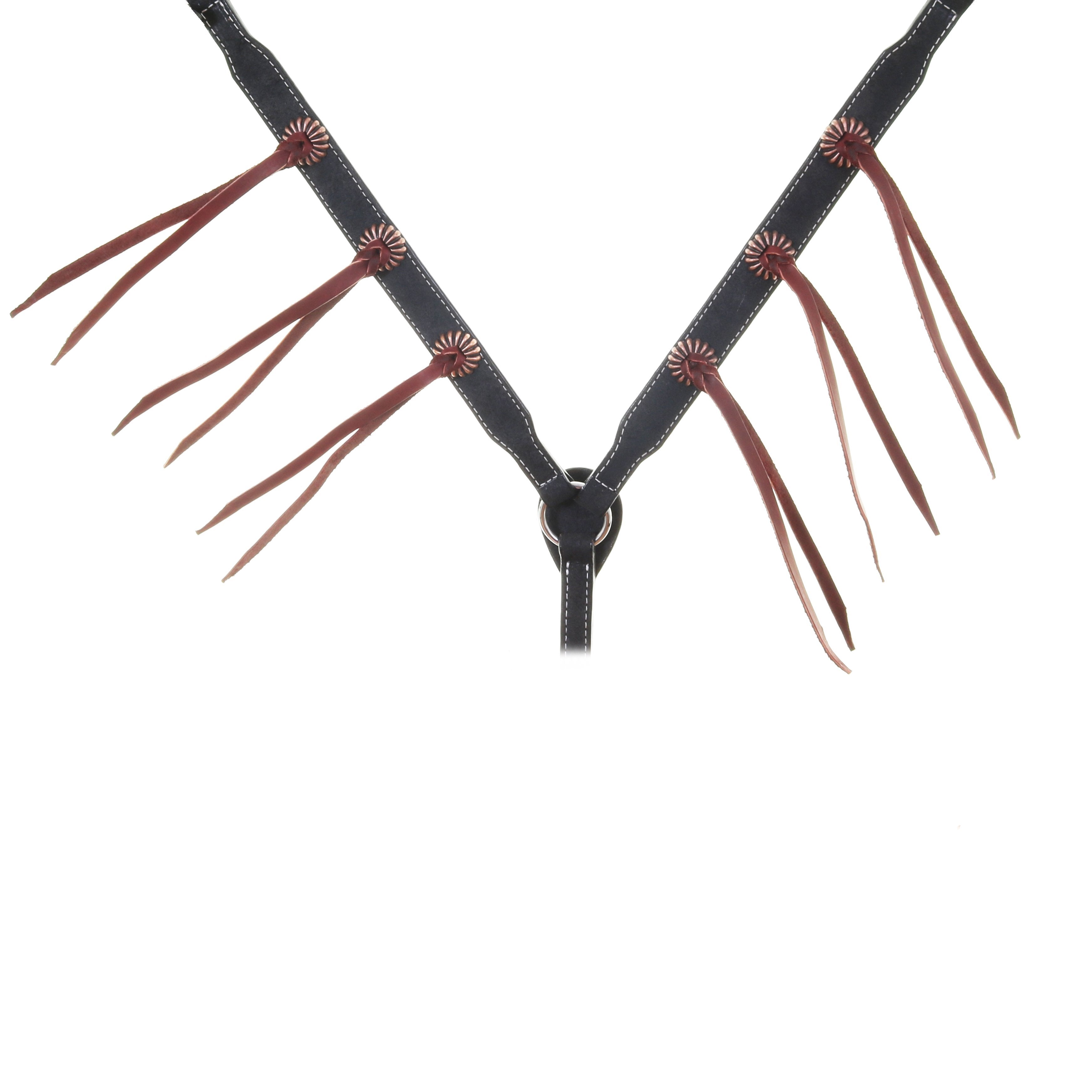 Black rough out breast collar with white stitching. Three antique copper parachute conchos with latigo laces on each side.
