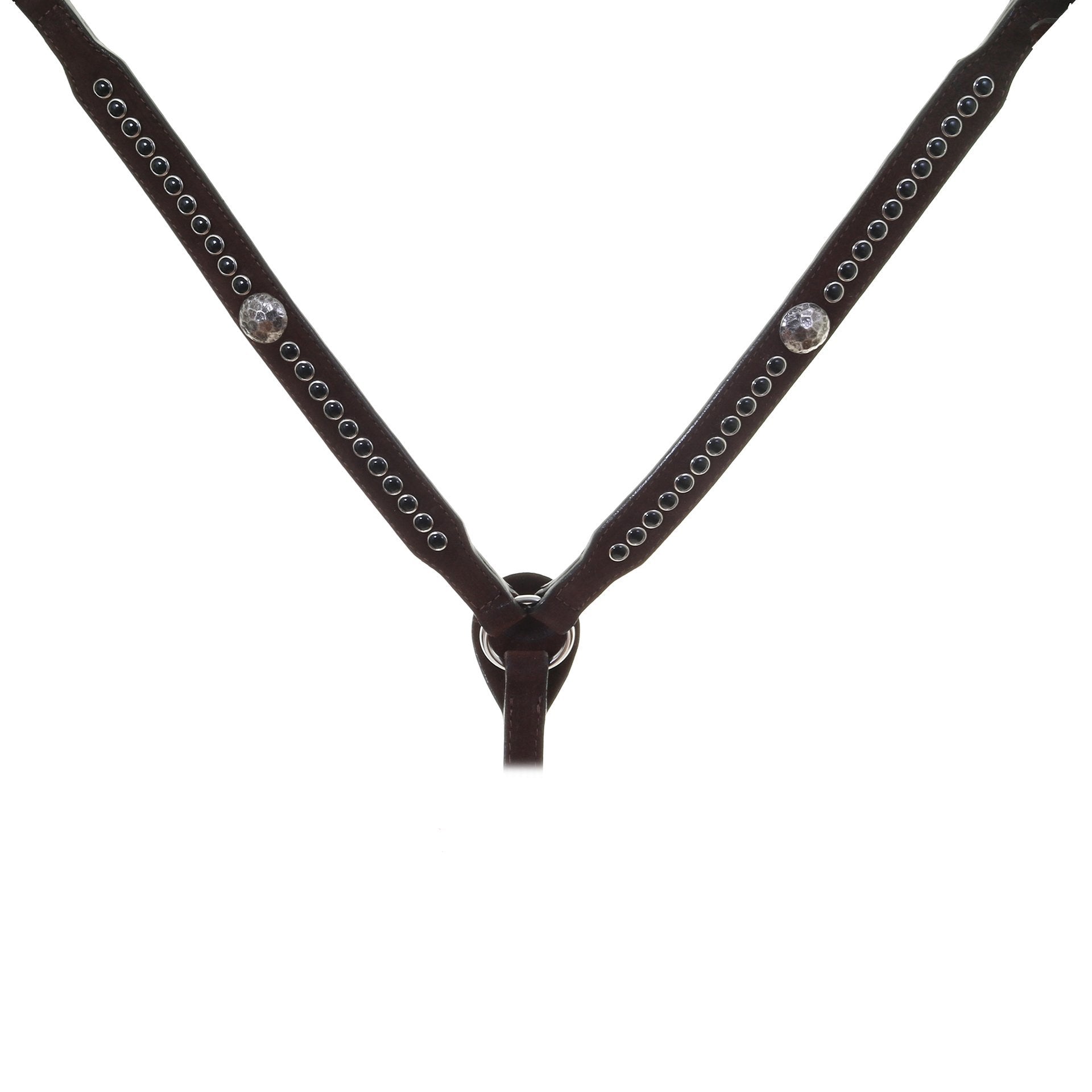 Brown rough out breast collar with black stone dots down the center. Accented with antique hammered conchos in center.