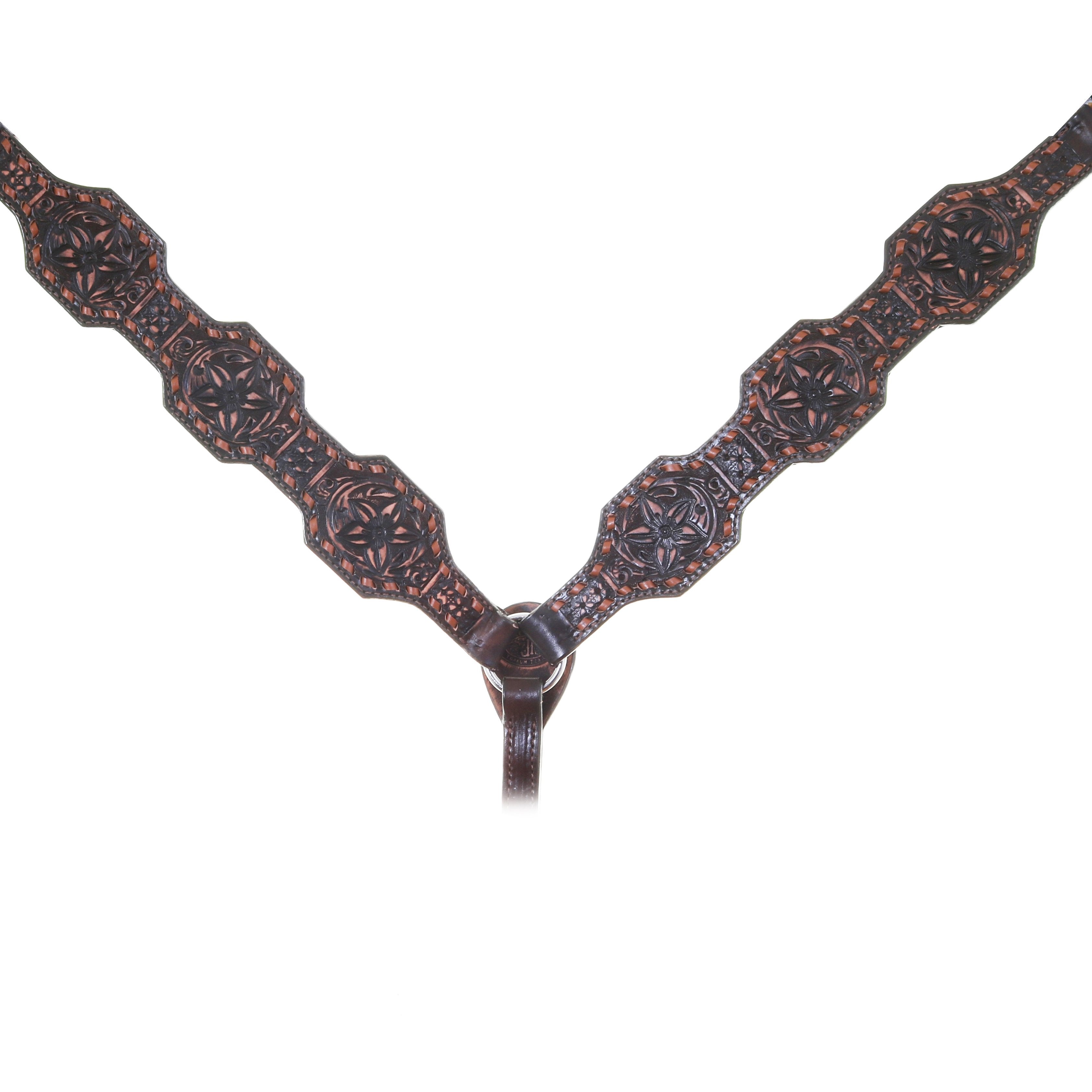 Breast collar in brown vintage leather with pozzi flower tooling and tan buck stitch along the edges.