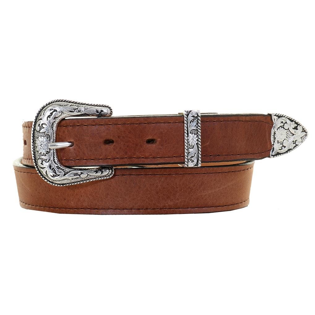 1 1/4" belt in brandy pull-up leather with antique silver floral leaf buckle set.