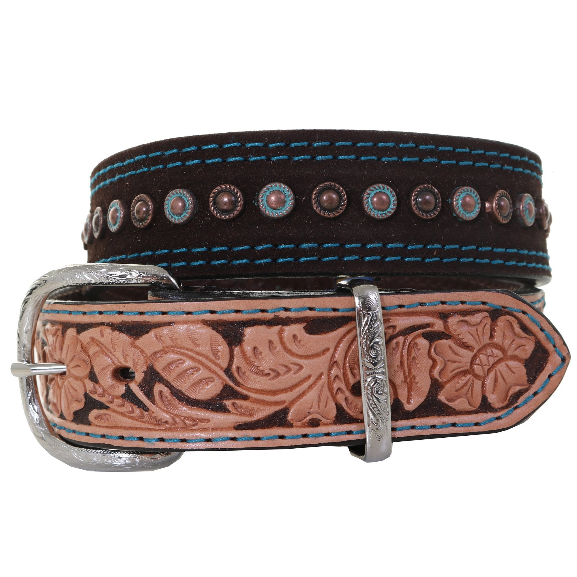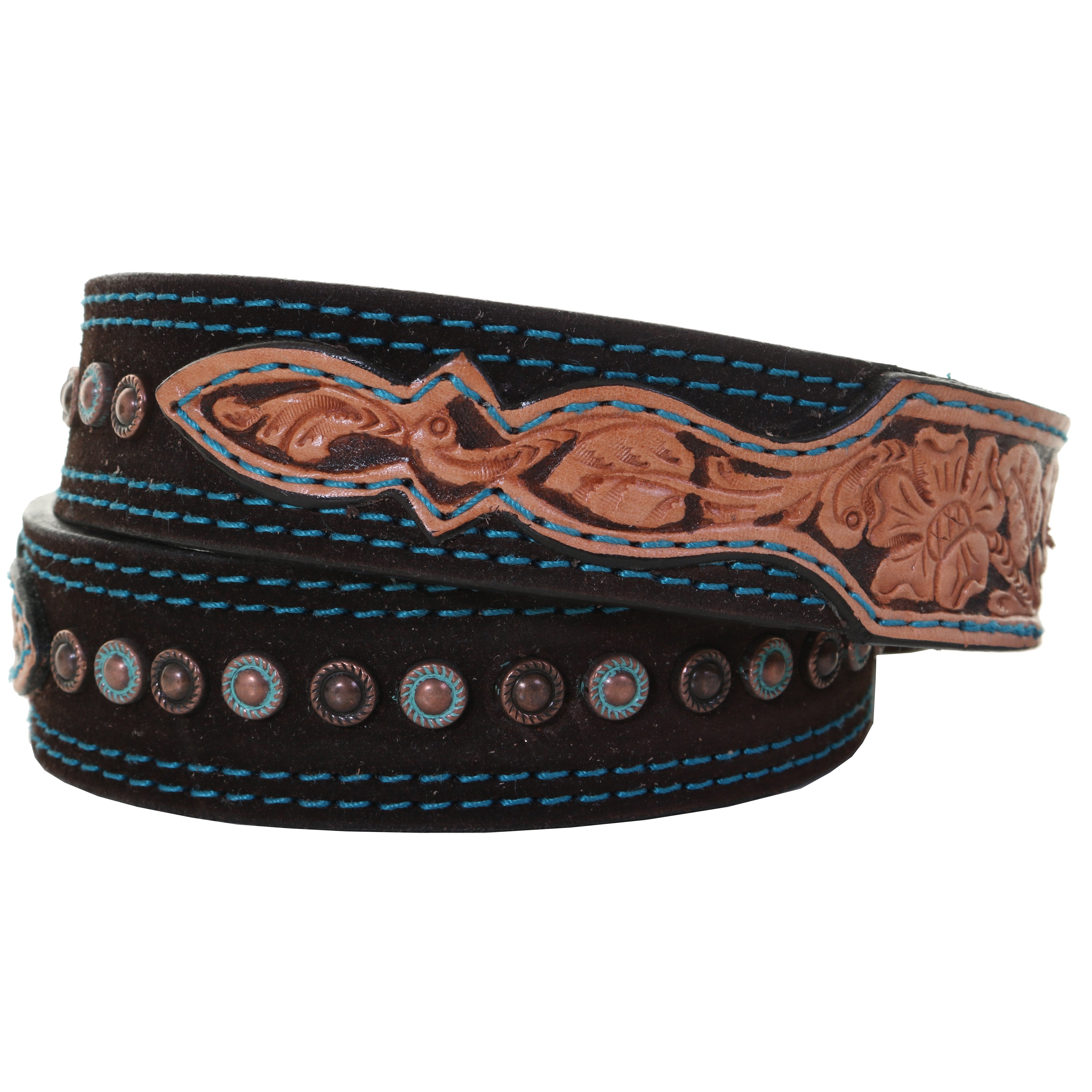 1 1/2" Belt - Brown Roughout Belt with Alternating Copper and Patina Dots, Double Row Turquoise Stitching, Fancy Billet Floral Tooled Ends