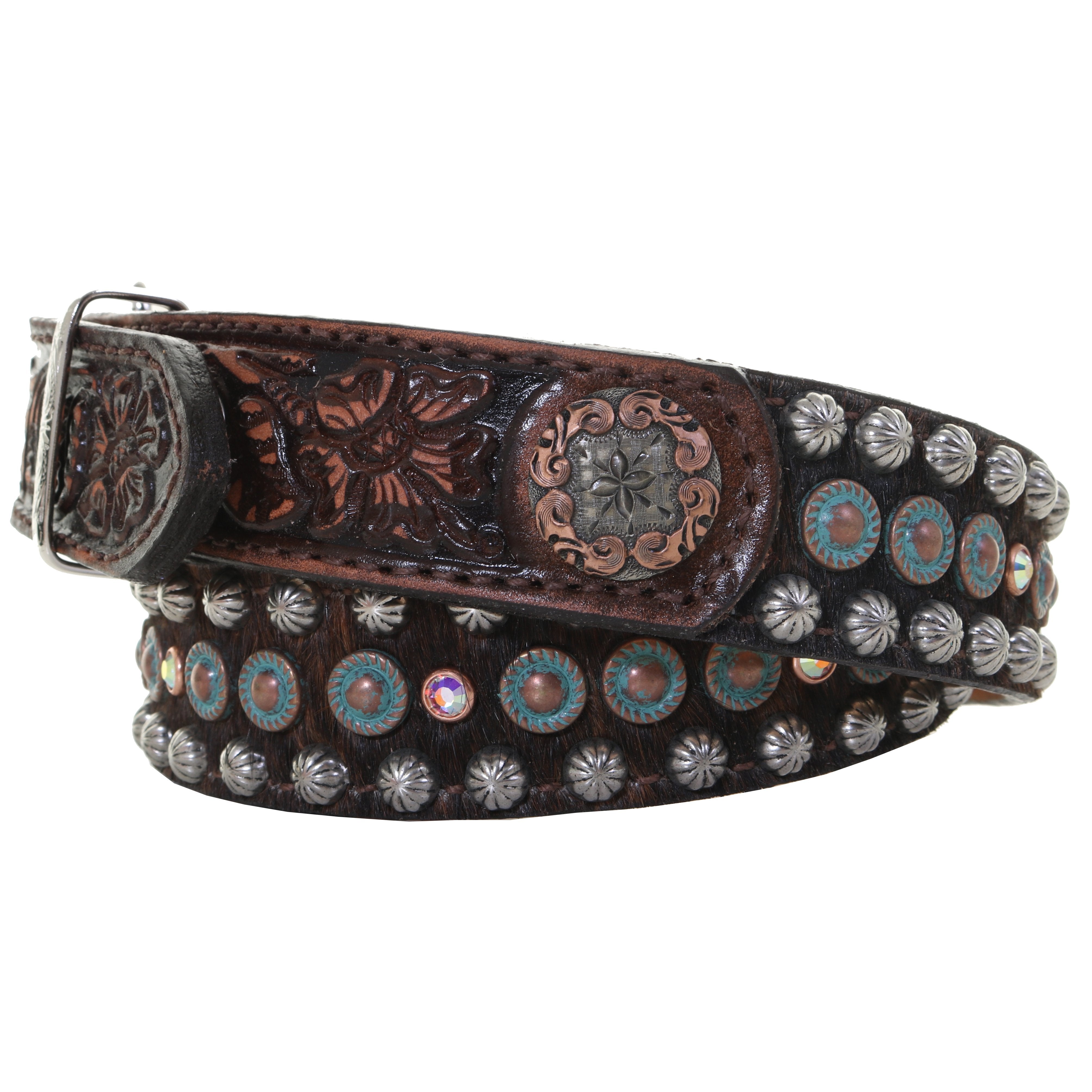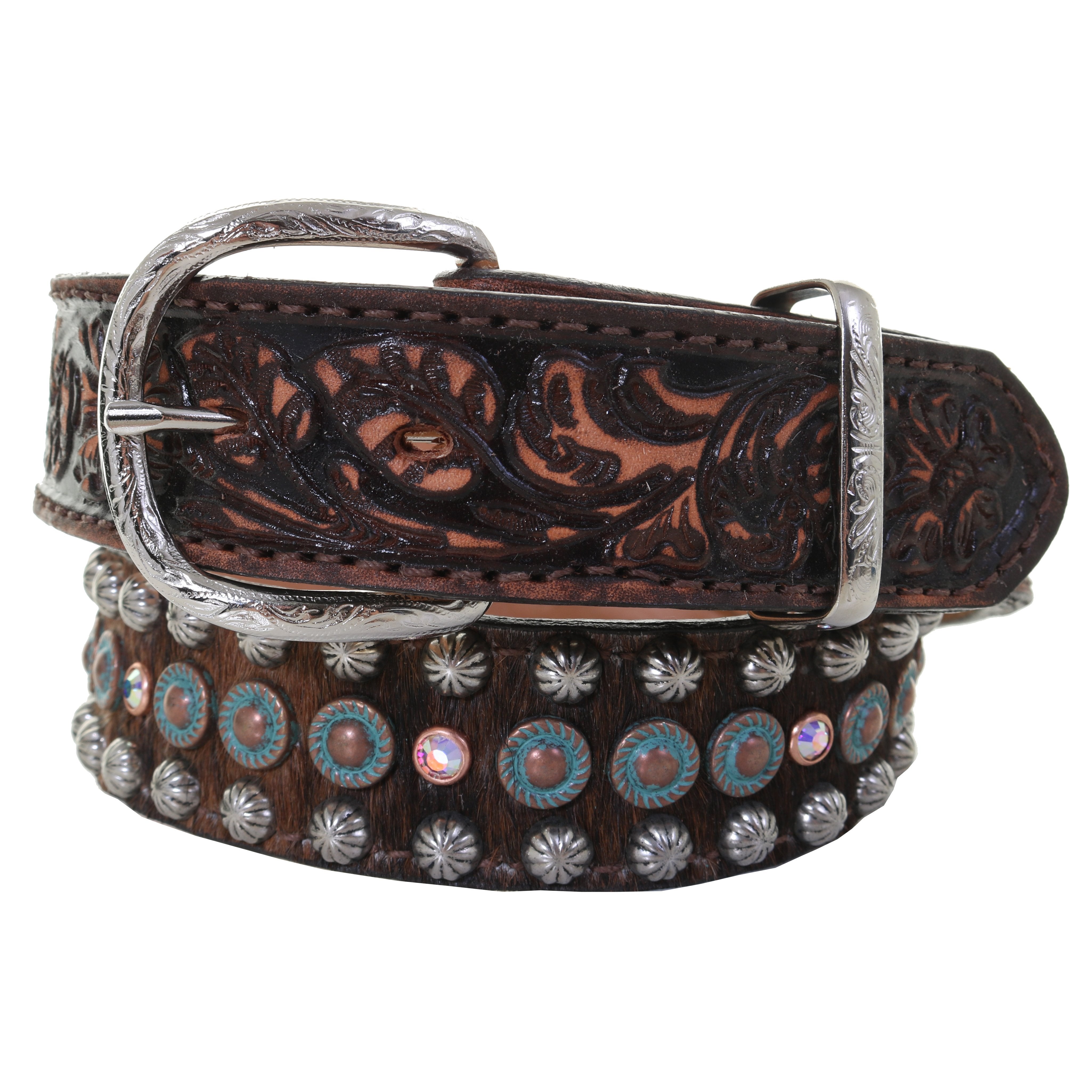 1 1/2" Brindle Hair Belt with Patina and Clear Swarovski Crystals, Antique Silver Parachute Edges, Brown Vintage Floral Tooled Billets with Antique Copper and Silver Conchos.