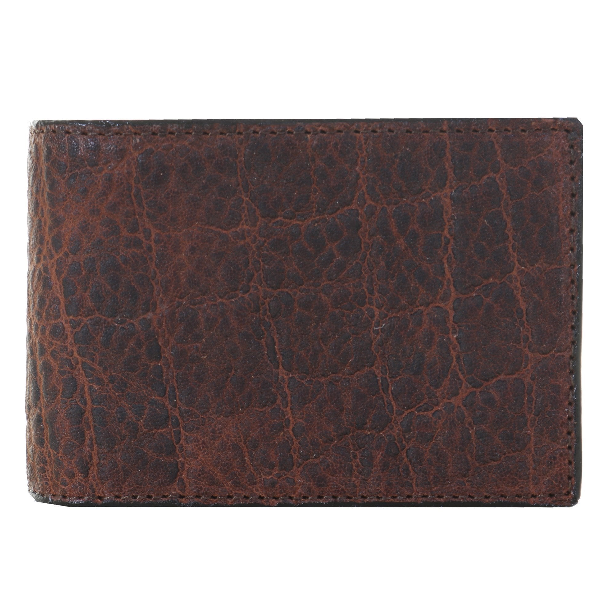 Bifold wallet in whiskey elephant print leather on both sides. Includes double sided picture window for driver's license or other I.D, 6 slots for credit cards, etc., 2 long dividers for cash, etc.
