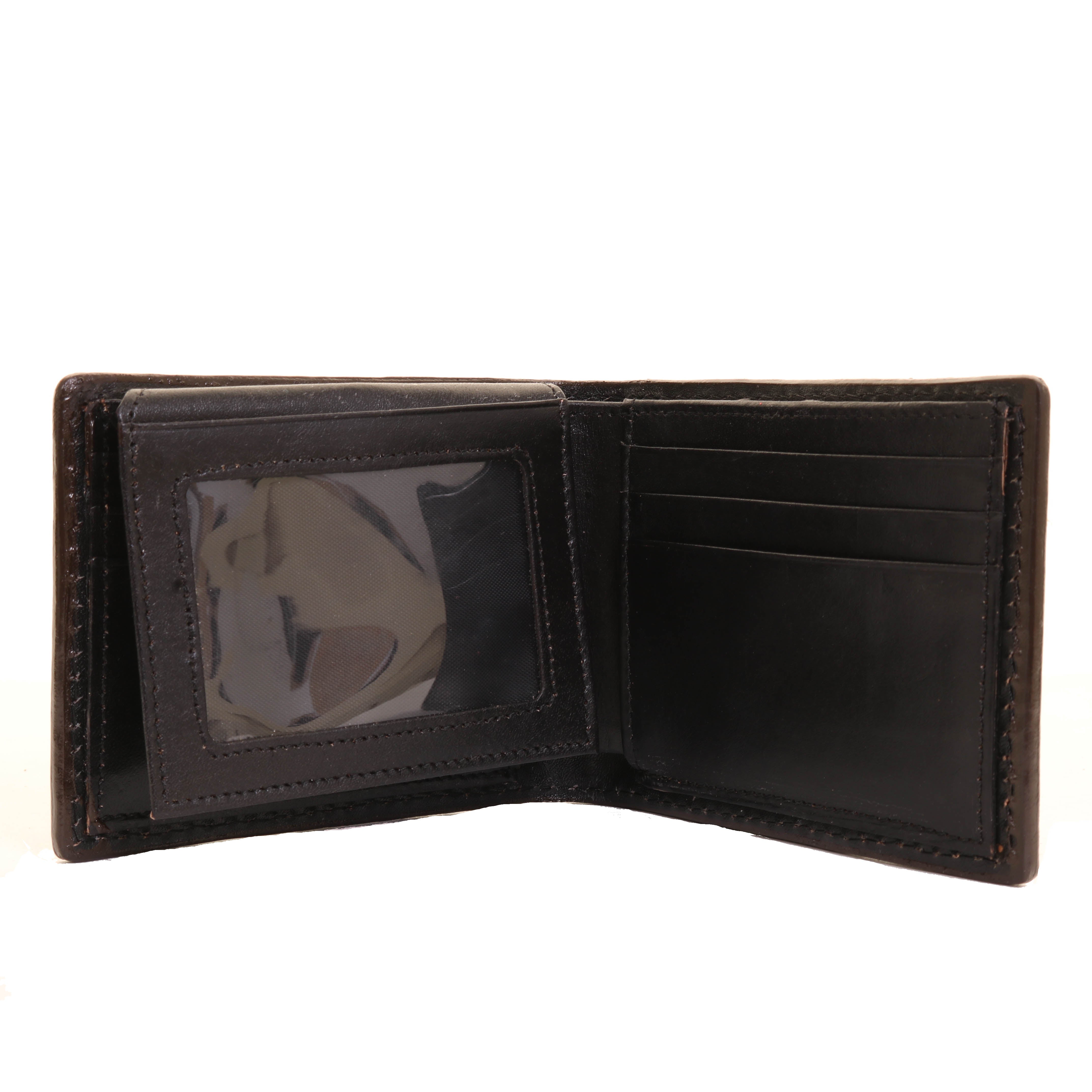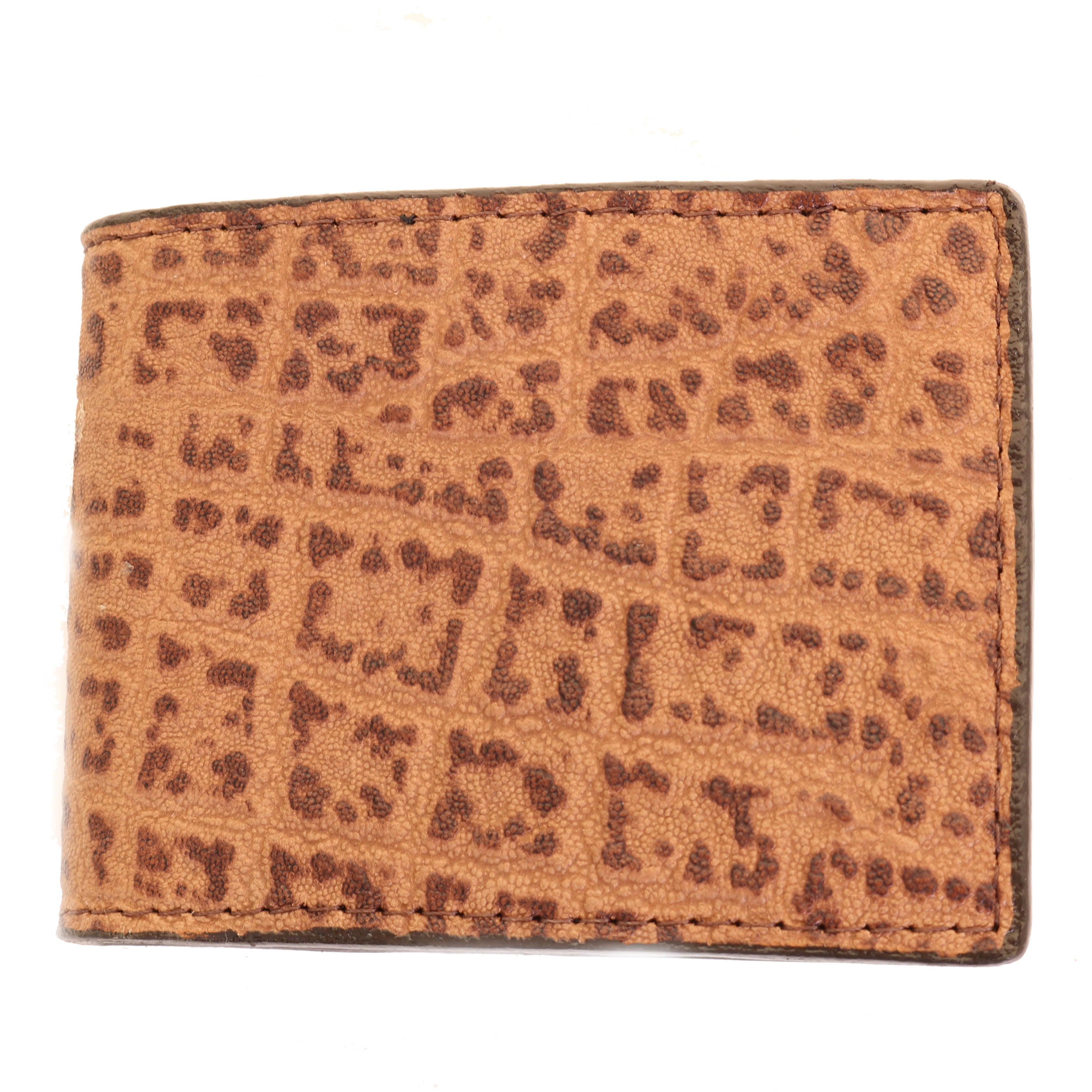 Bifold wallet in Safari Tan Elephant print leather on both sides.  Includes double sided picture window for driver's license or other I.D, 6 slots for credit cards, etc., 2 long dividers for cash, etc.