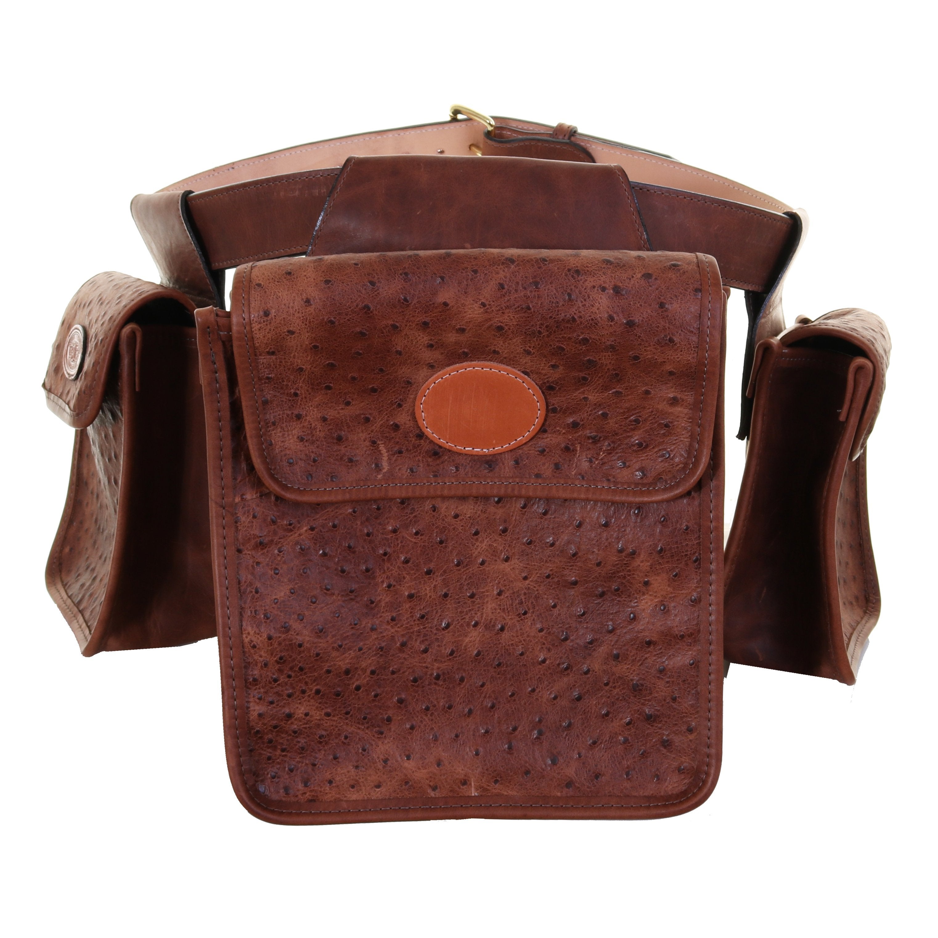 Vintage ostrich print bird bag with brandy pull-up trim and belt. Also includes a customizable initials plaque.