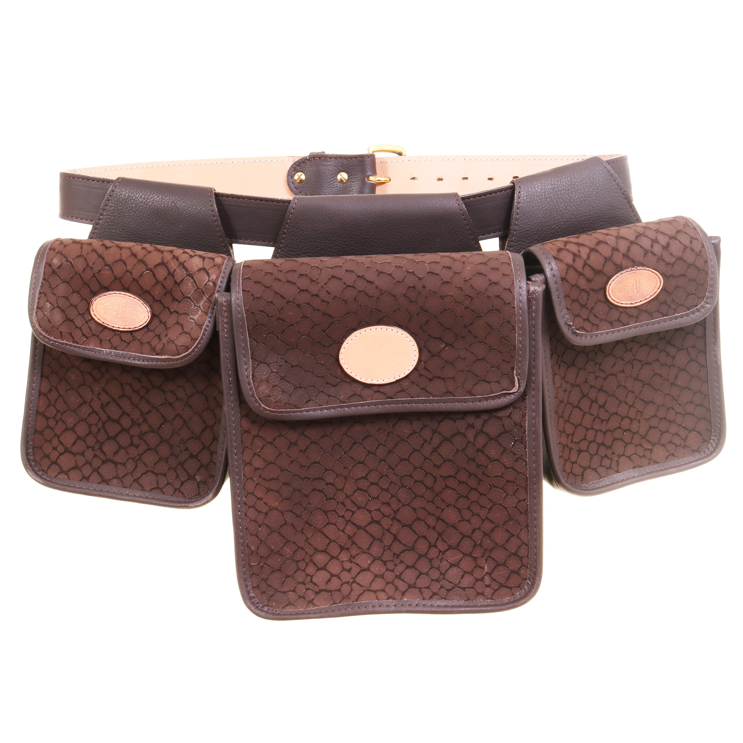 Brown suede gator print bird bag with chocolate chap trim and belt. Also comes with customizable initials plaque.