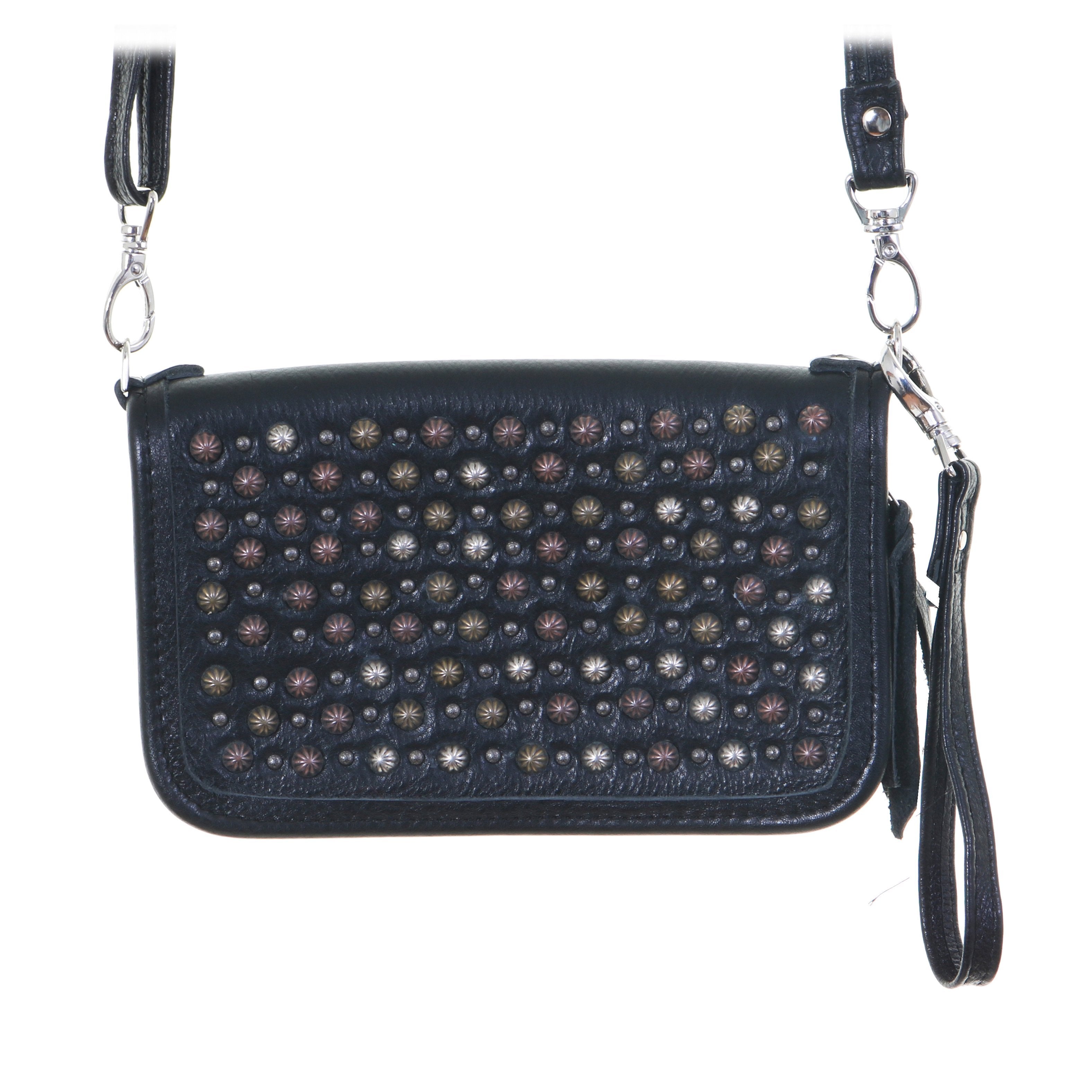 Black chap leather clutch organizer with a mixture of antique copper, brass and silver parachute dots on front separated by small antique silver dots. Black chap detachable long adjustable strap and wristlet included. The inside features: check book holder, credit card slots, clear license holder, divided pockets and a zippered coin pouch.