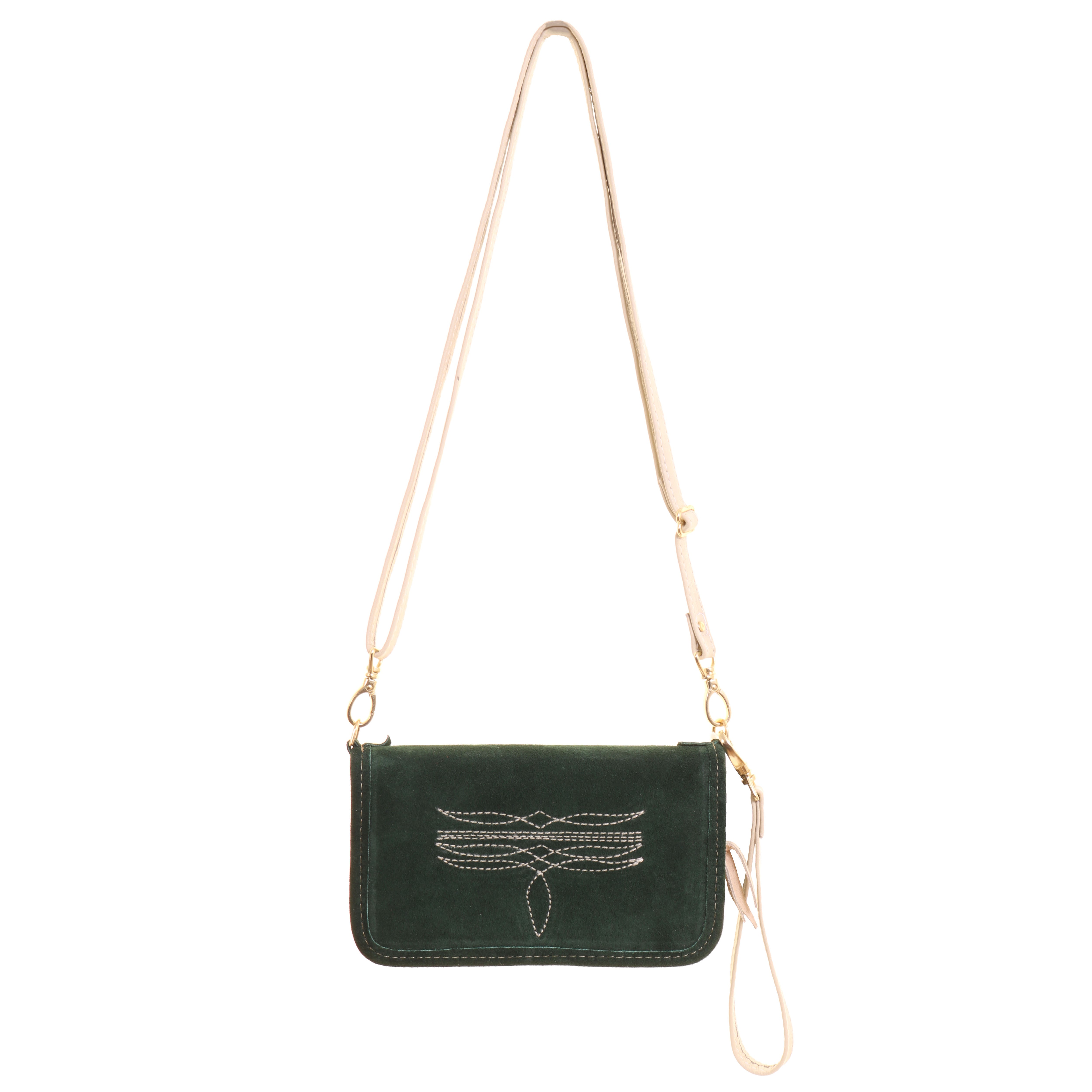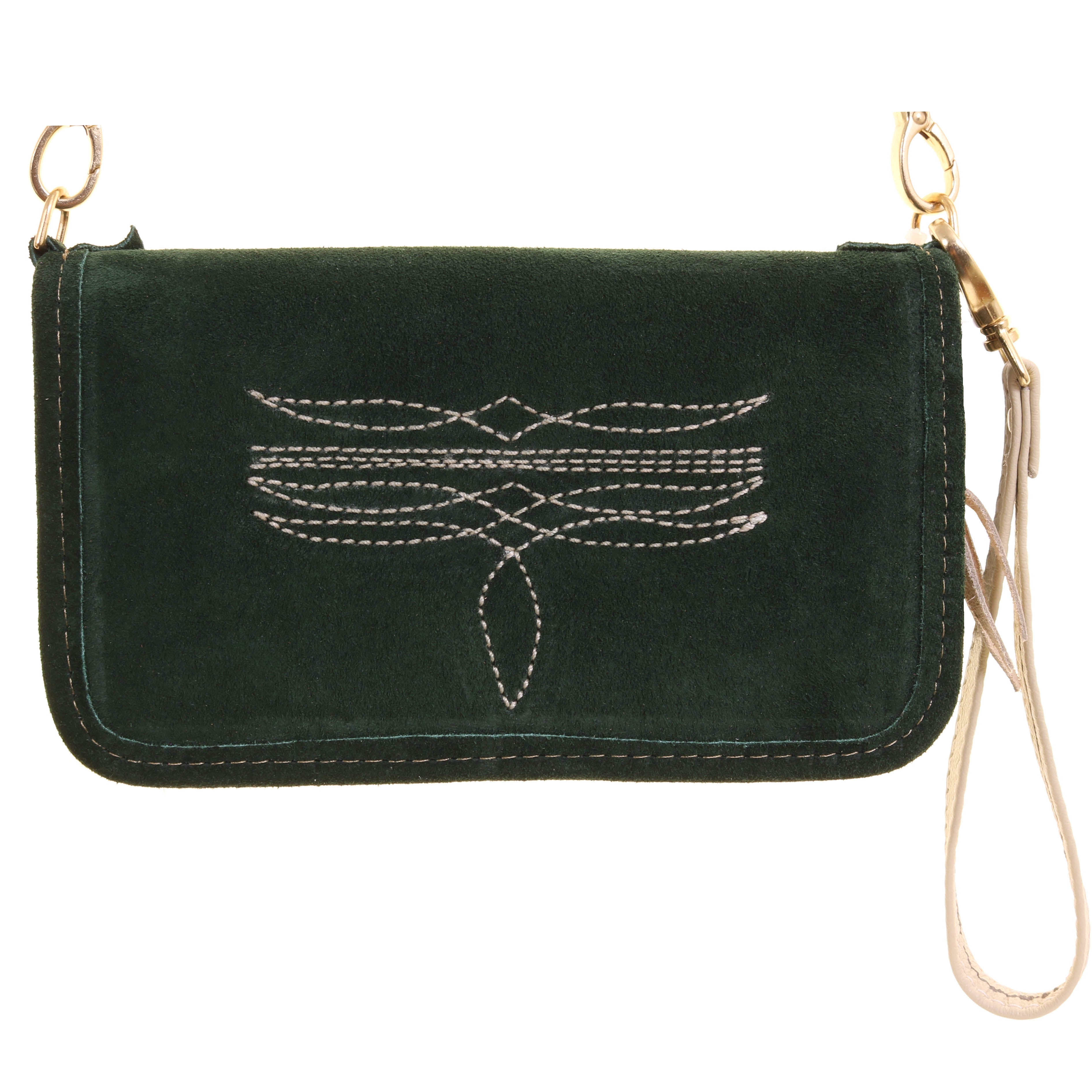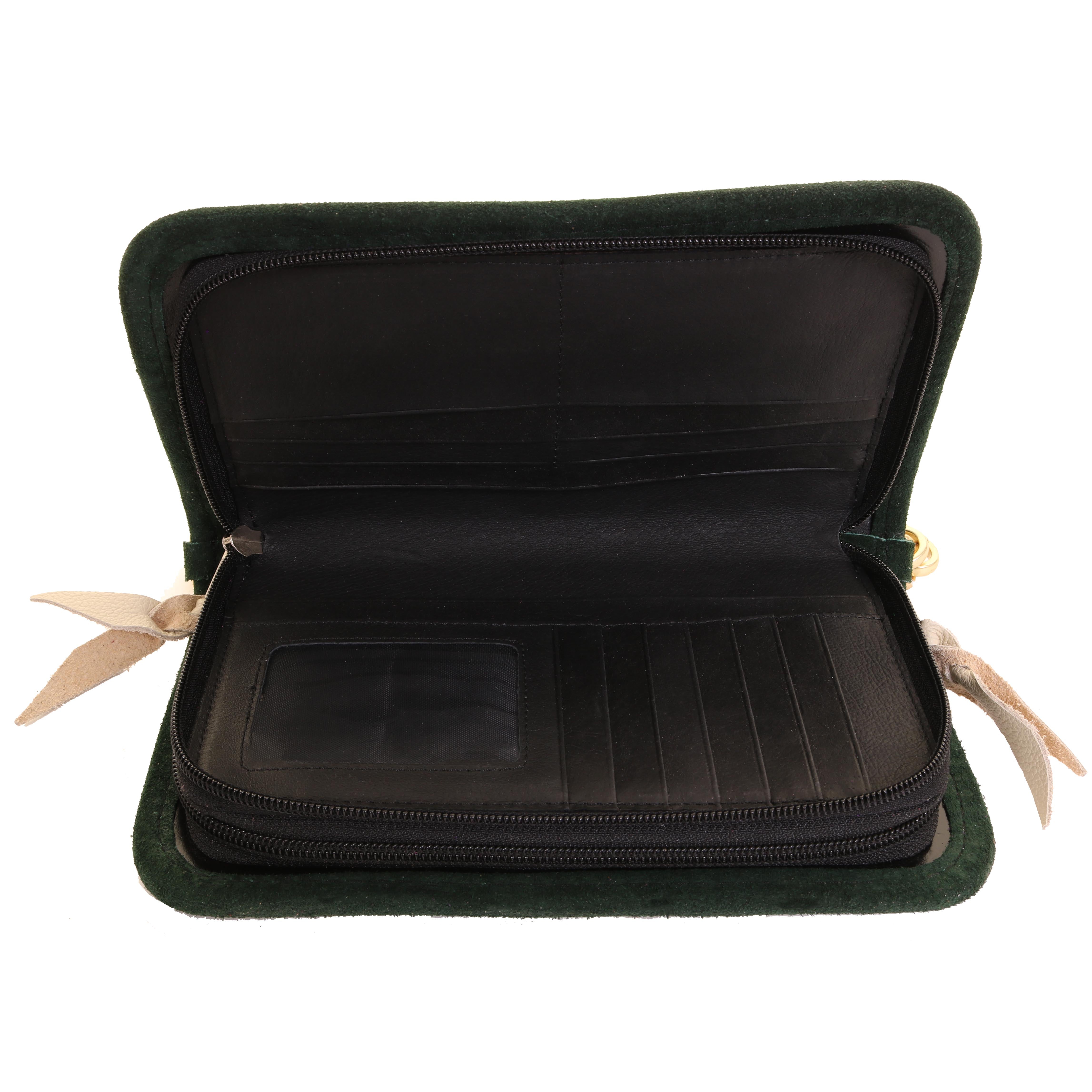 Premium Forest Green Suede clutch organizer with white stitching figure 8. - Silver Hardware