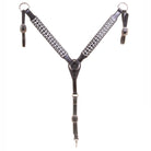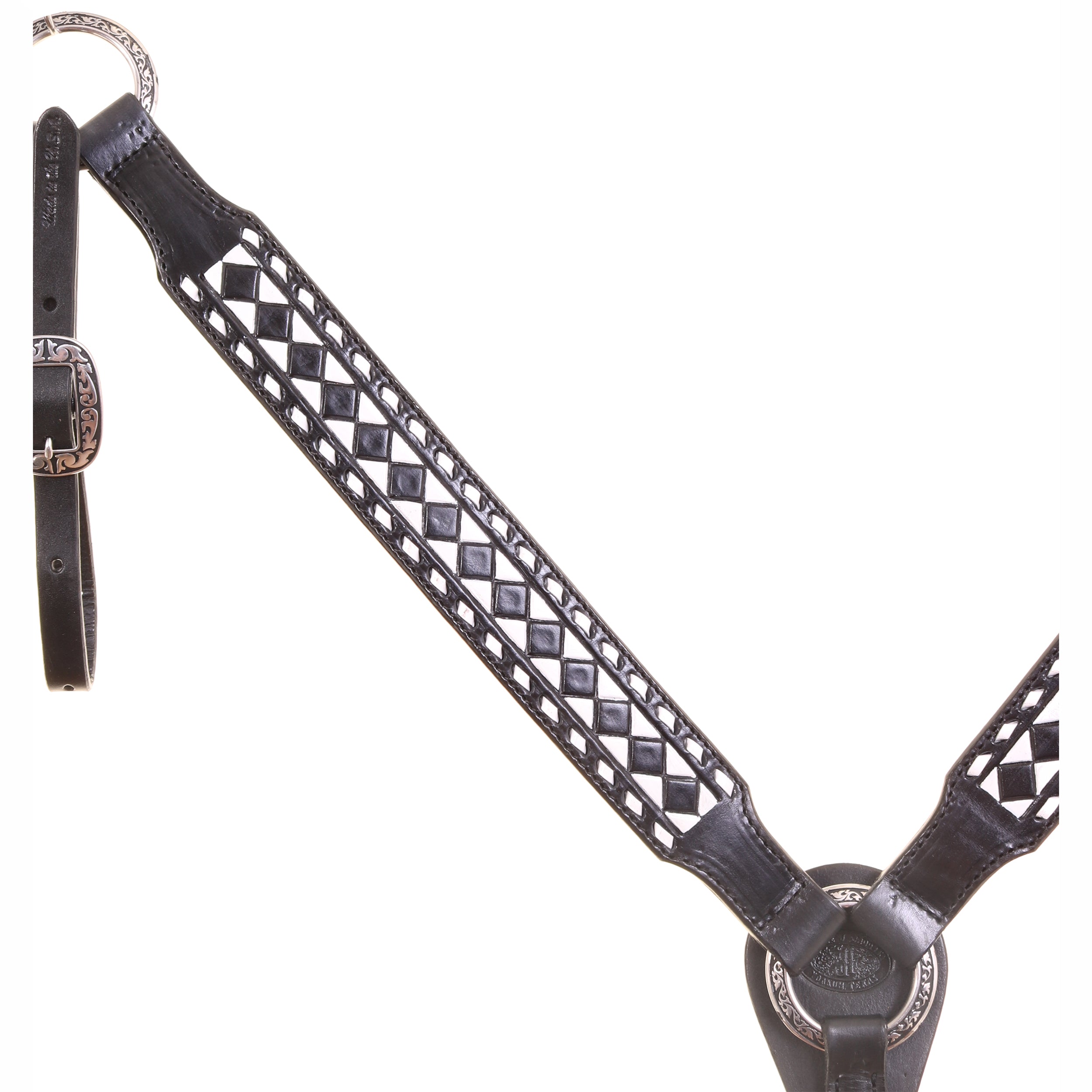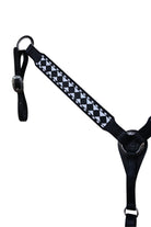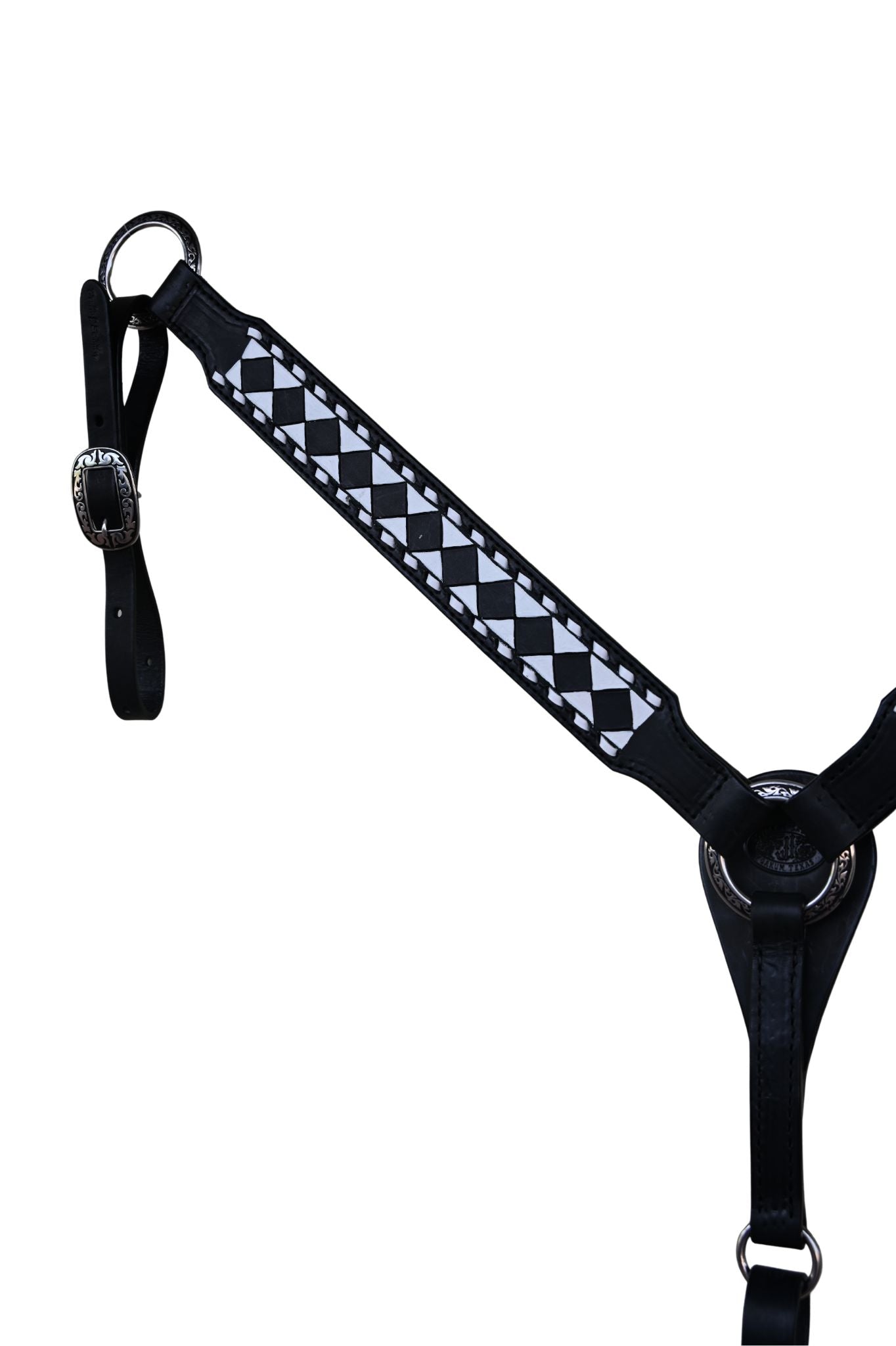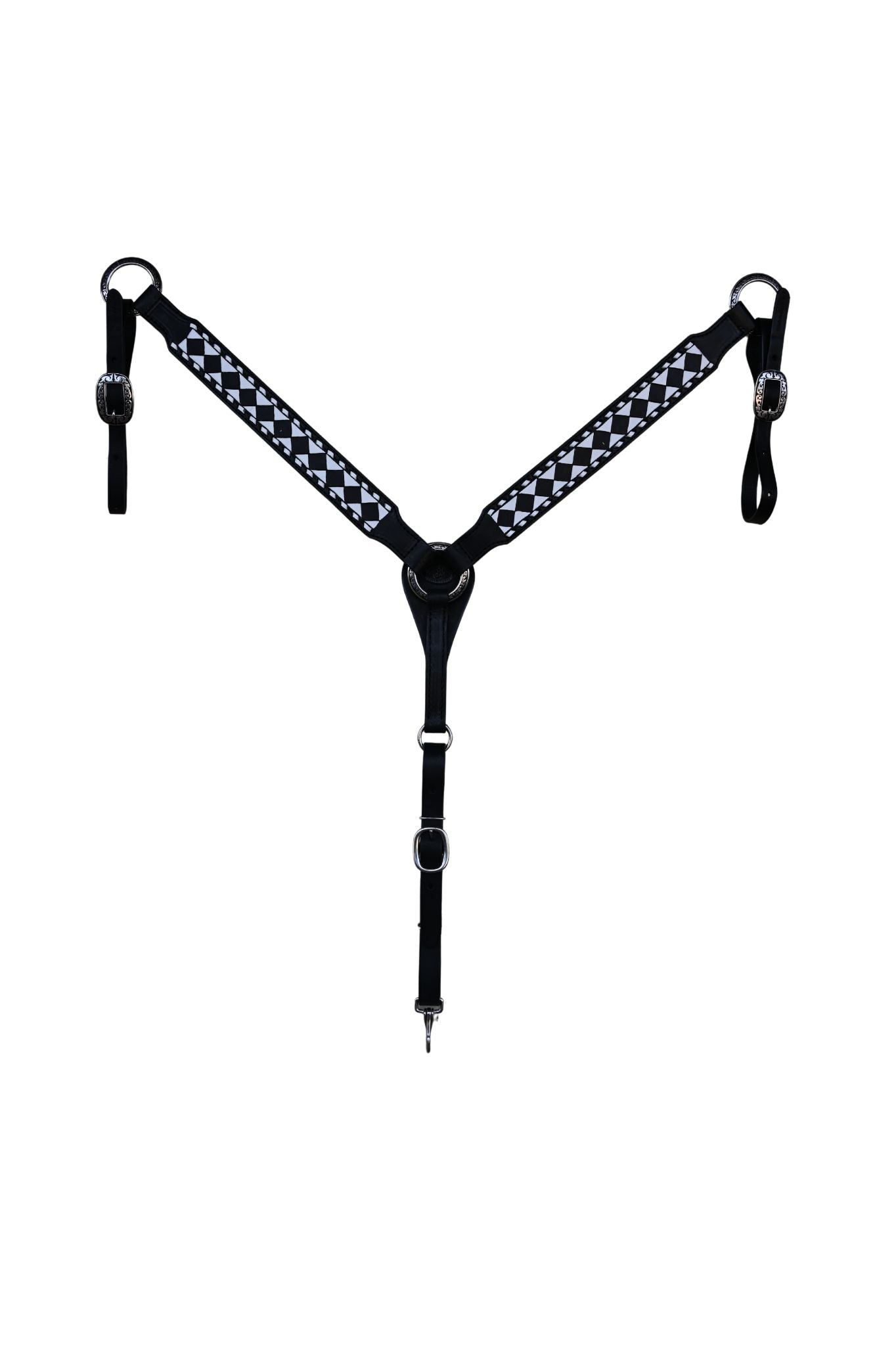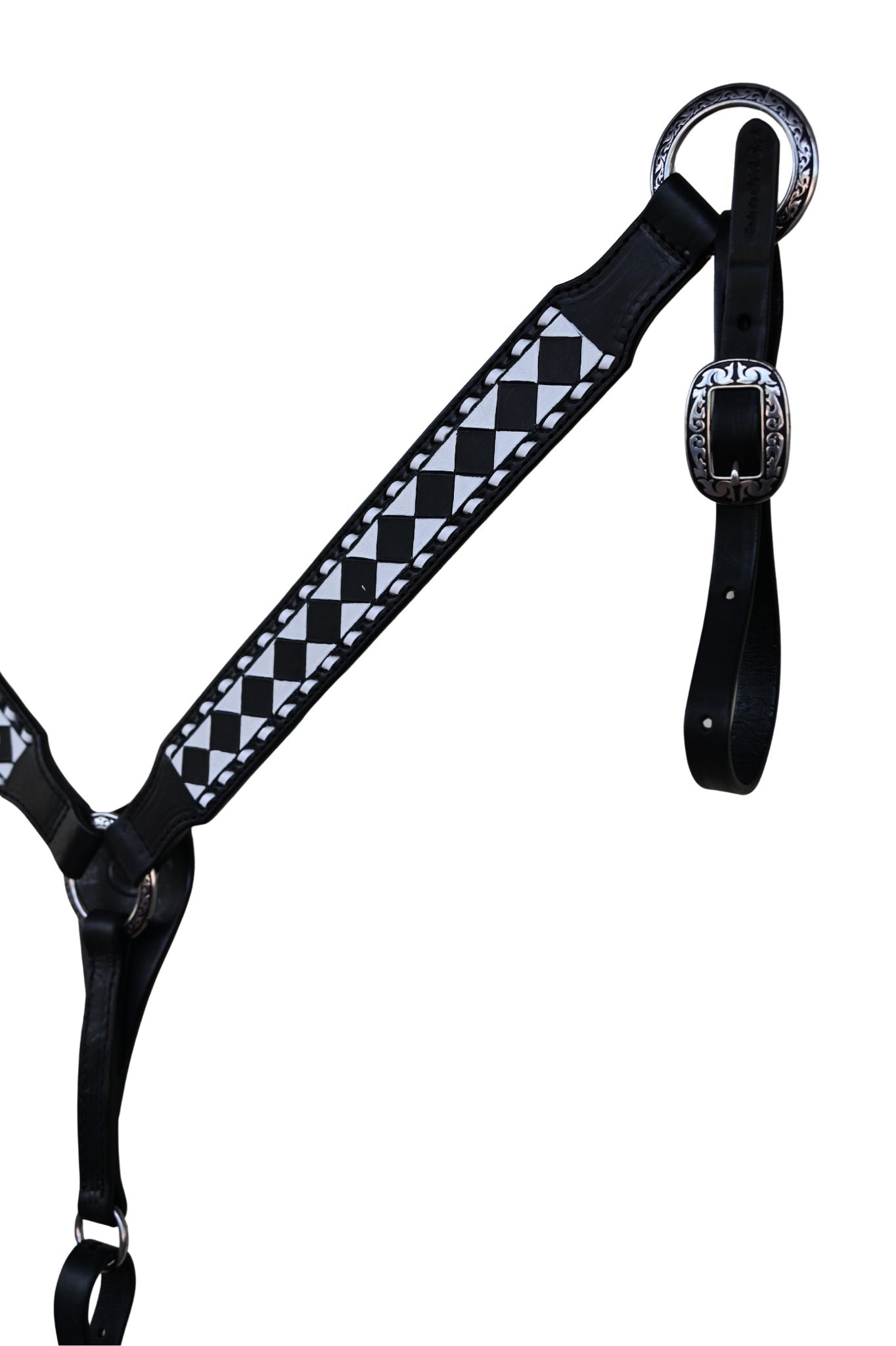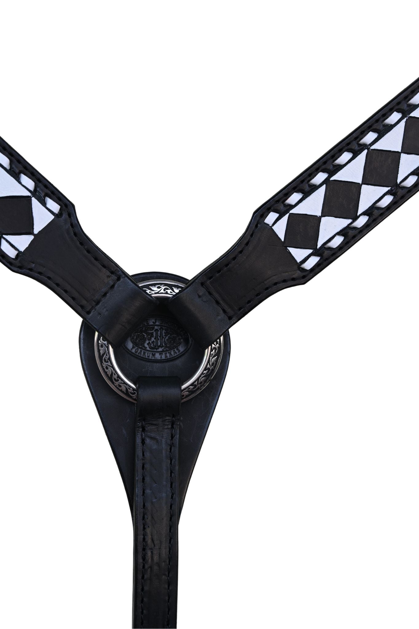 Tooled Checker Board Breast Collar features a distinctive checkered tooling pattern complemented by white buck stitch detailing. Designed to perfectly match the SPL33 Double J Legend Barrel Racer saddle, it offers both style and functionality for barrel racing enthusiasts seeking a coordinated, professional look.