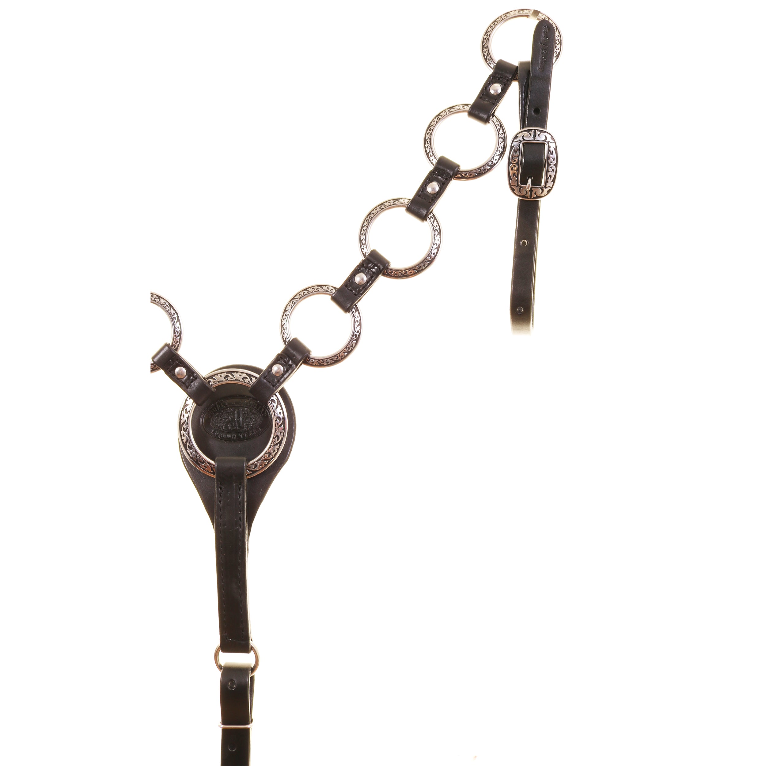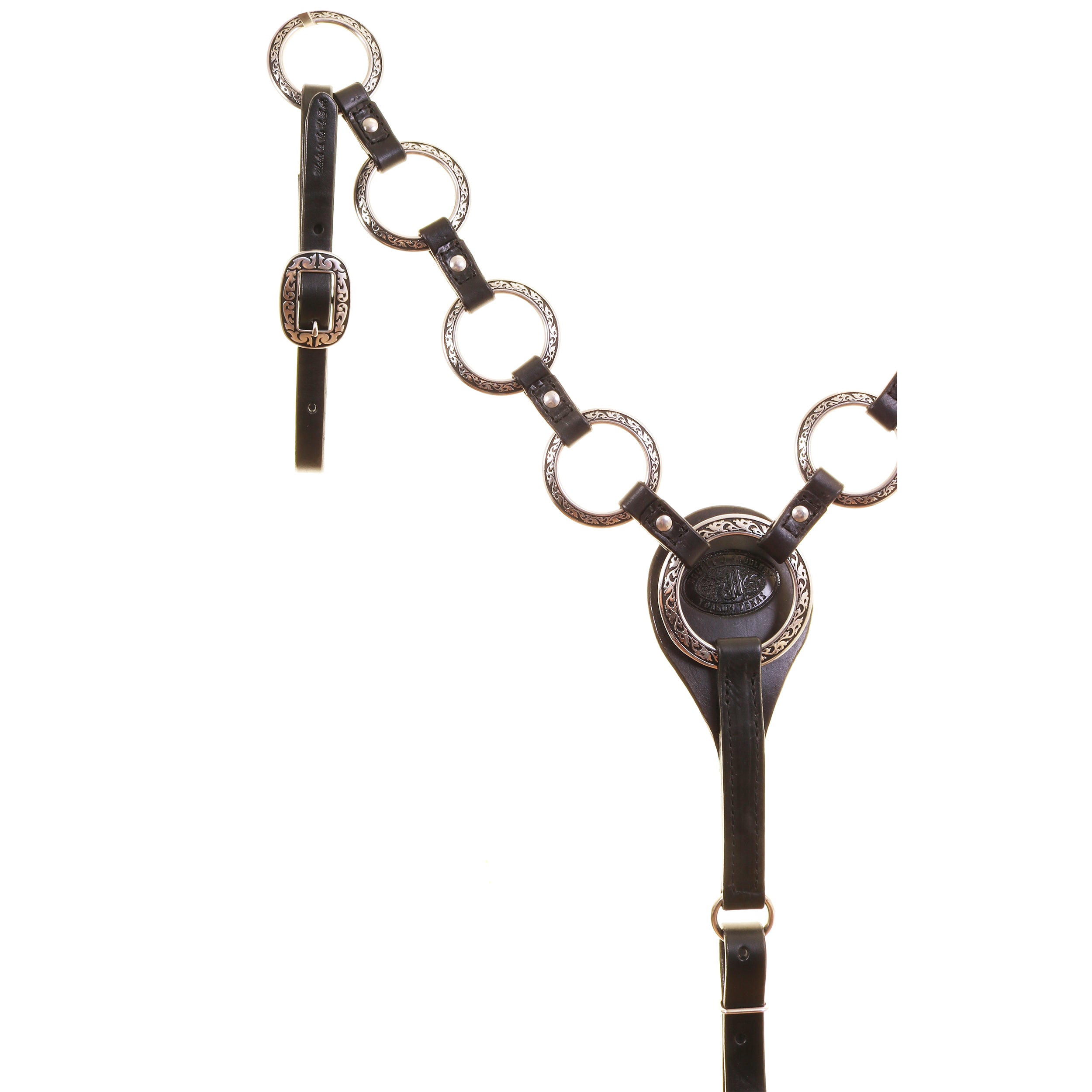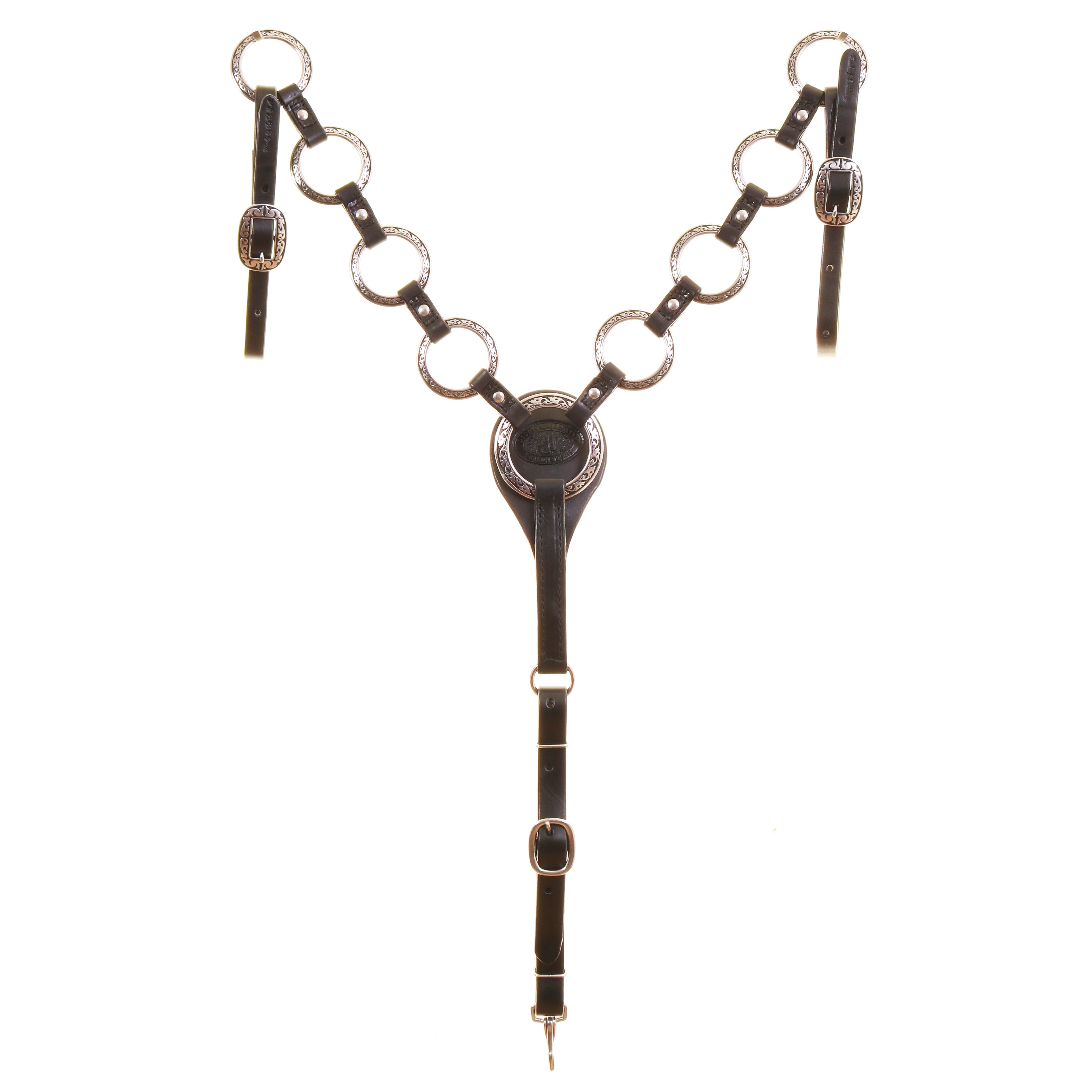 Black Leather Olympian Gladiator Breast Collar with 2" Antique Silver Engraved Rings and Matching Antique Silver Engraved Buckles.
