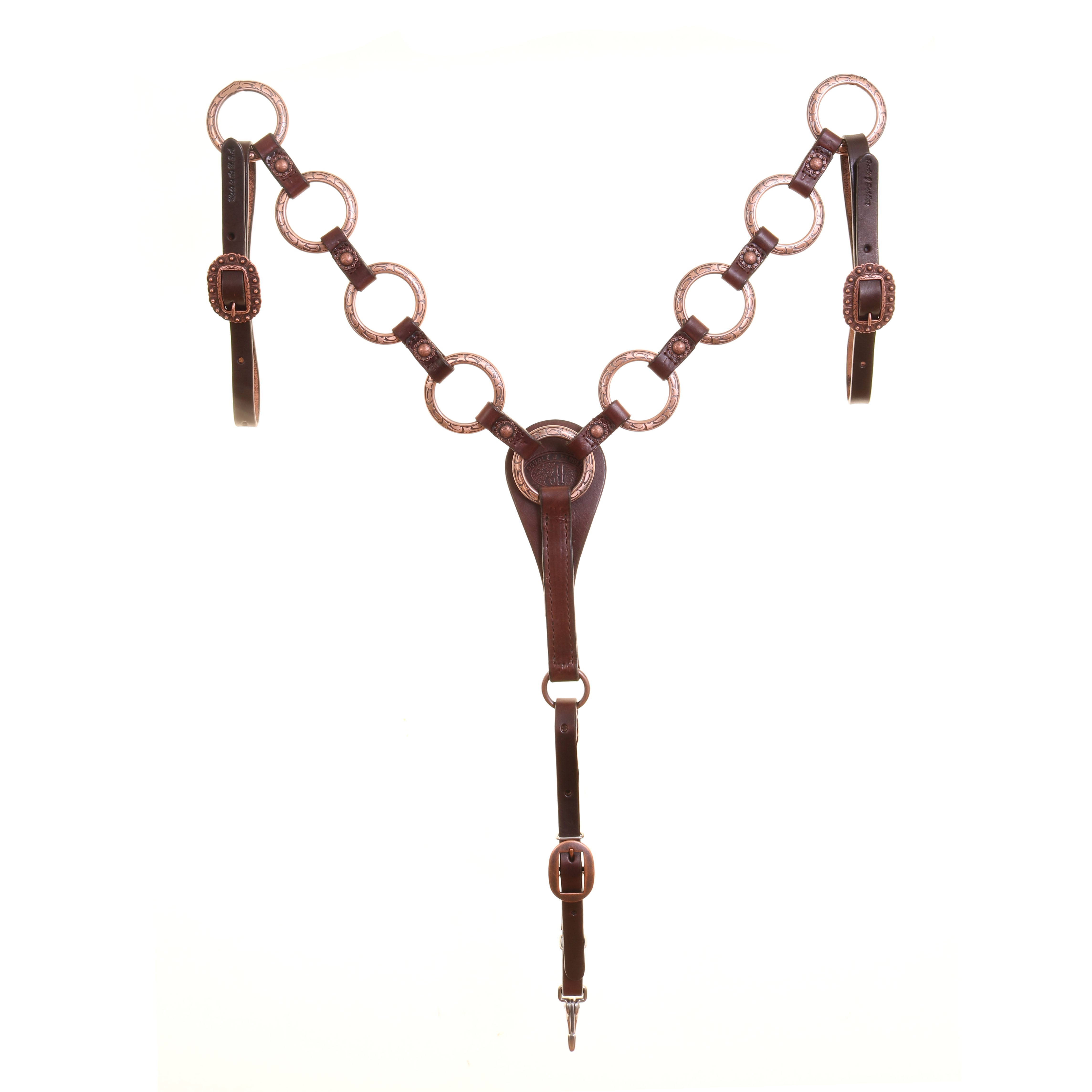 Upgrade your tack collection with the Olympian Berry Breast Collar - this breast collar features an elegant design accented with copper rings, copper berry conchos, and rich brown leather.