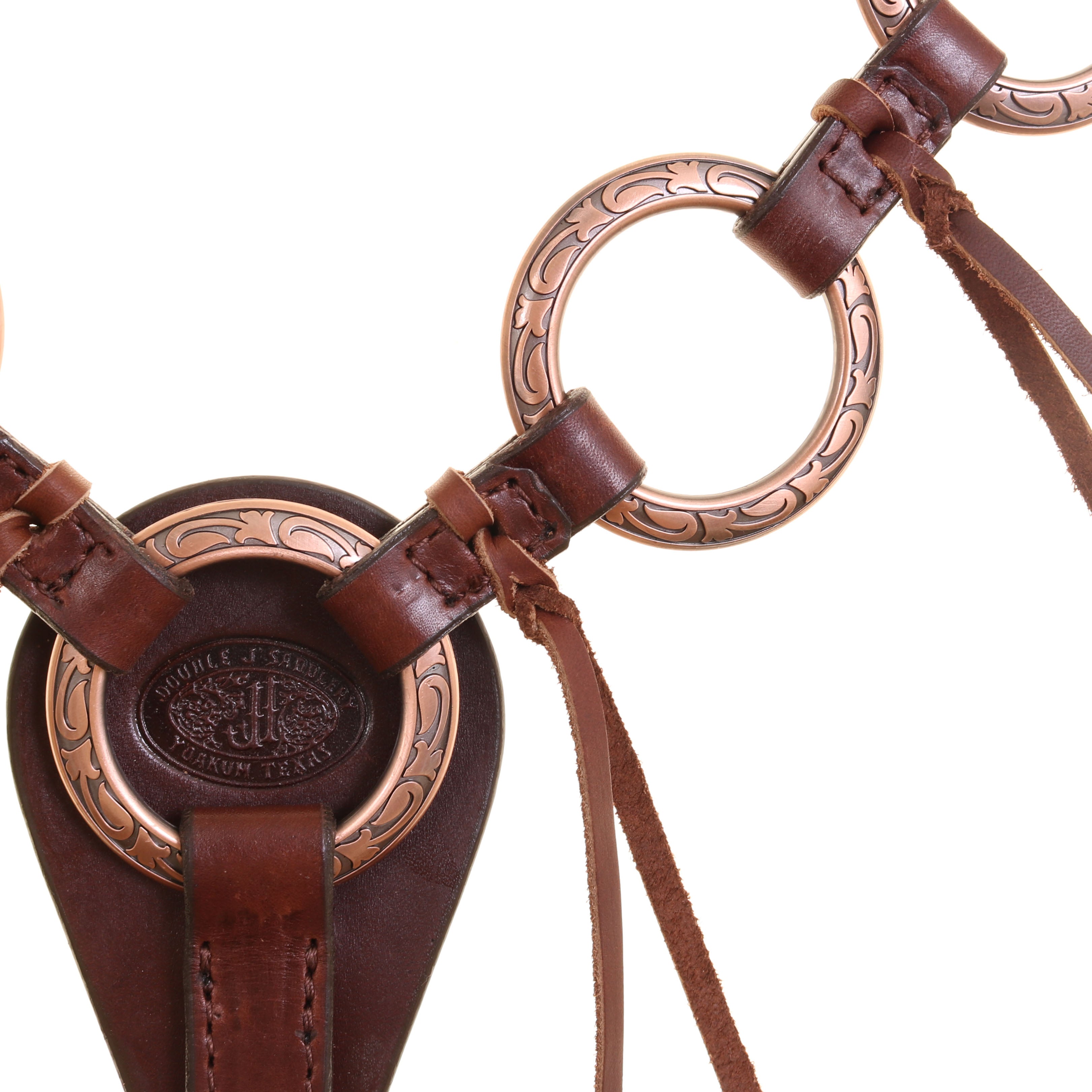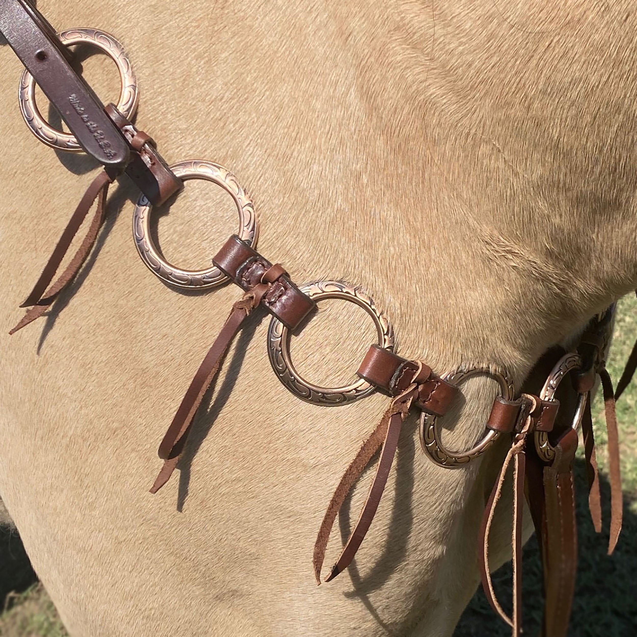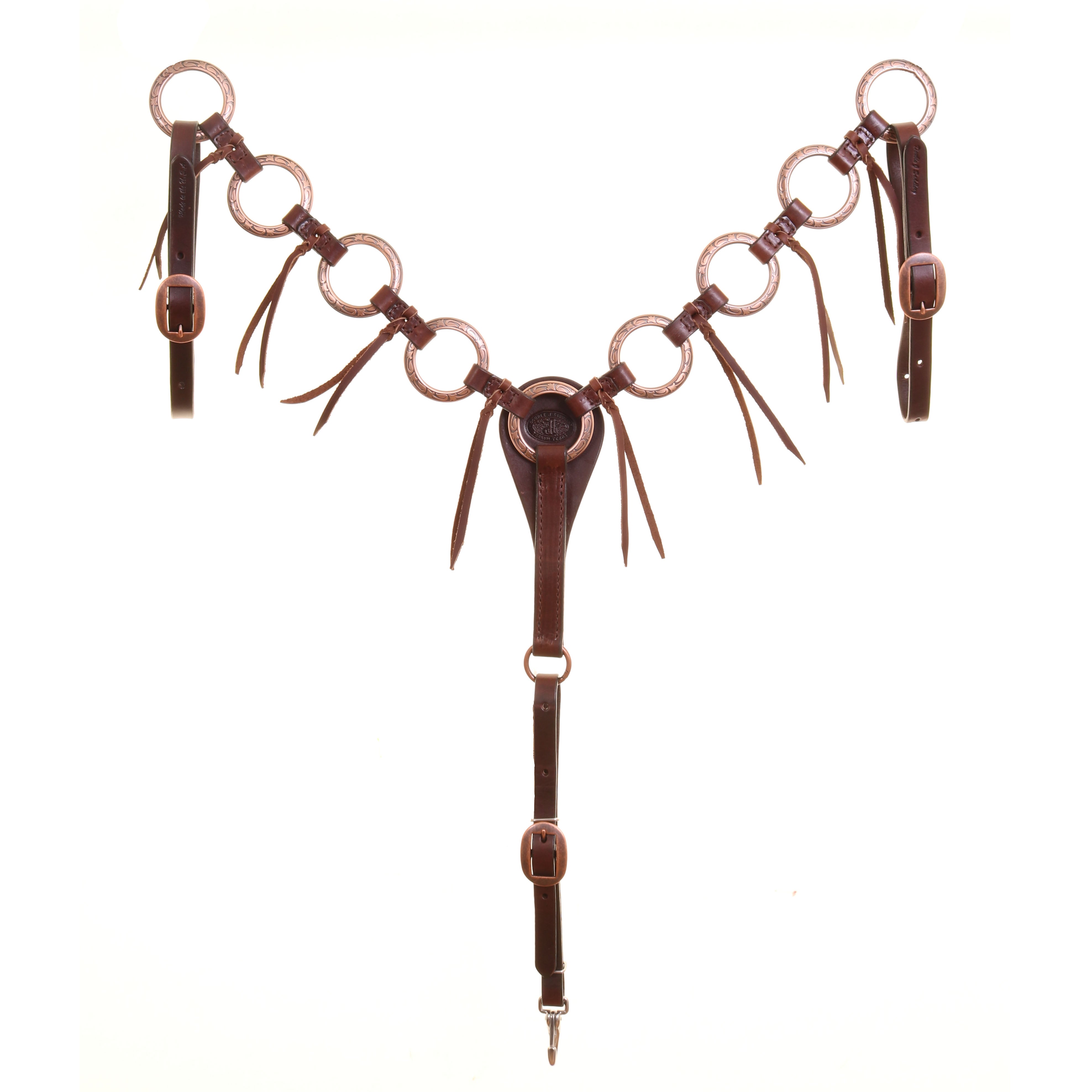 Upgrade your tack collection with the Olympian Fringe Breast Collar - this breast collar features an elegant design accented with copper rings, leather fringe, and rich brown leather.