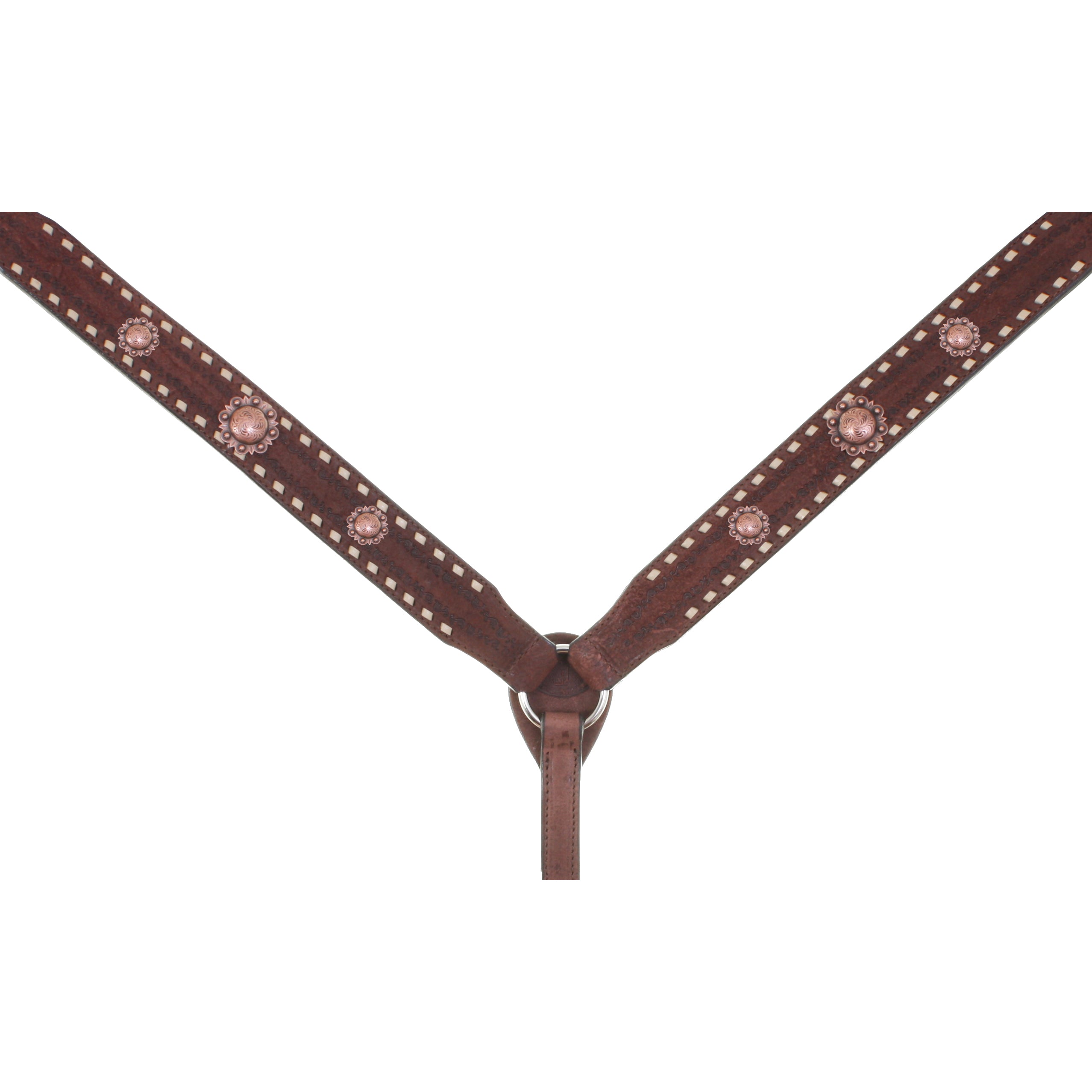 Brown rough out breast collar with swirl border tooling, cream buckstitch, and 3 antique copper berry conchos on each side.