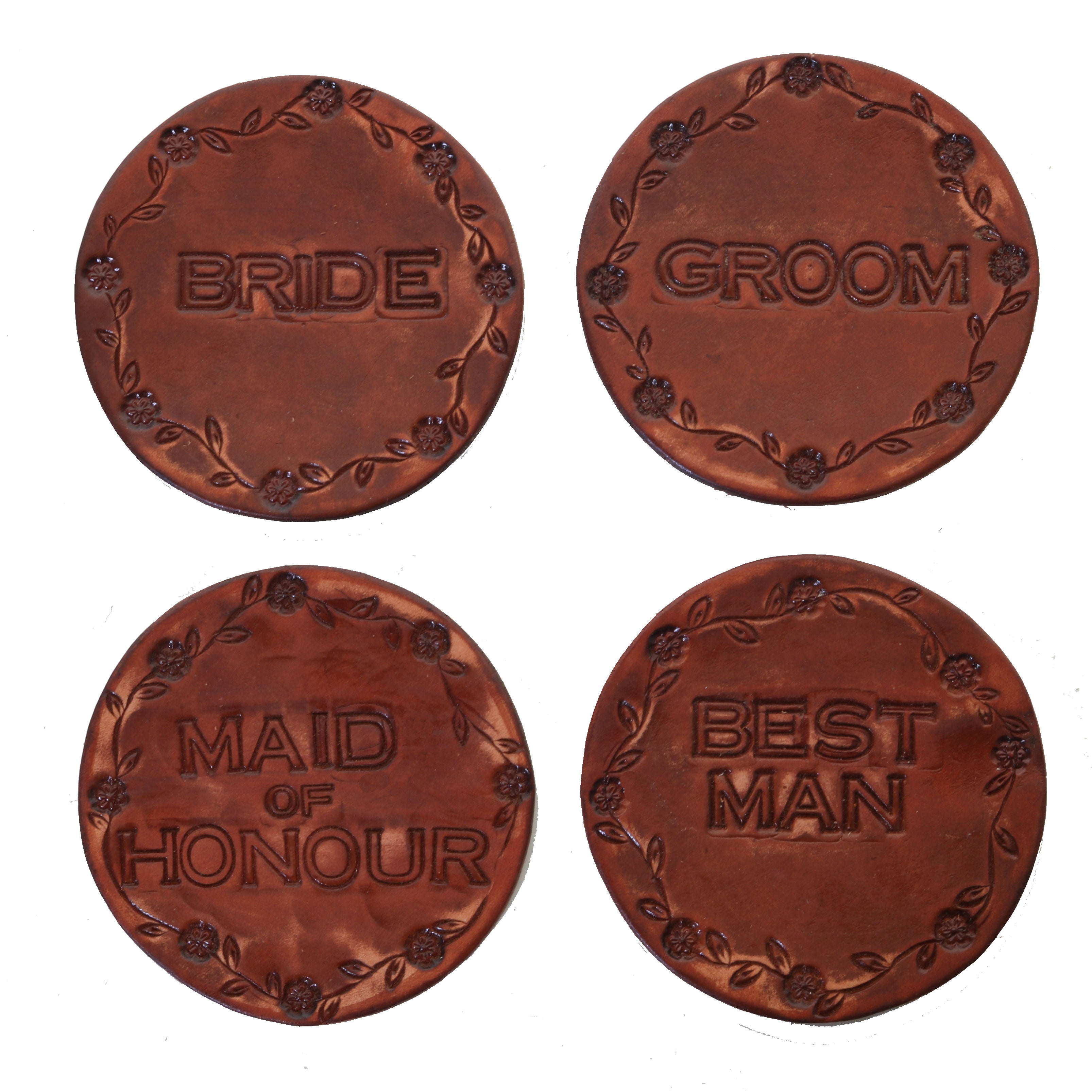 Placeholder tooled leather coasters - set of 4 (Bride, Groom, Maid of Honour, Best Man). Nicely bordered with flower, leaf and vine design.