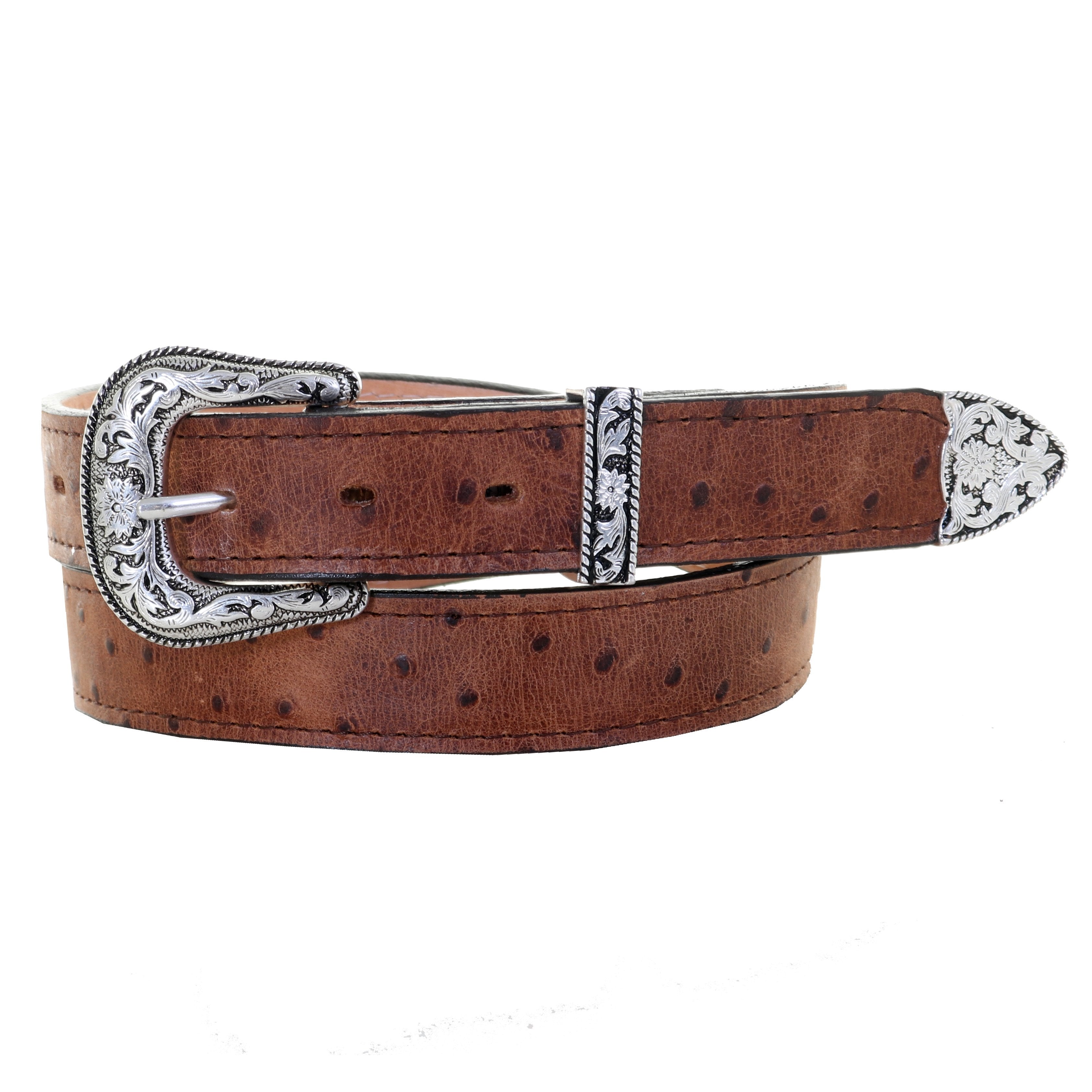 1 1/4" belt in vintage cognac ostrich print leather with antique silver floral leaf buckle set.