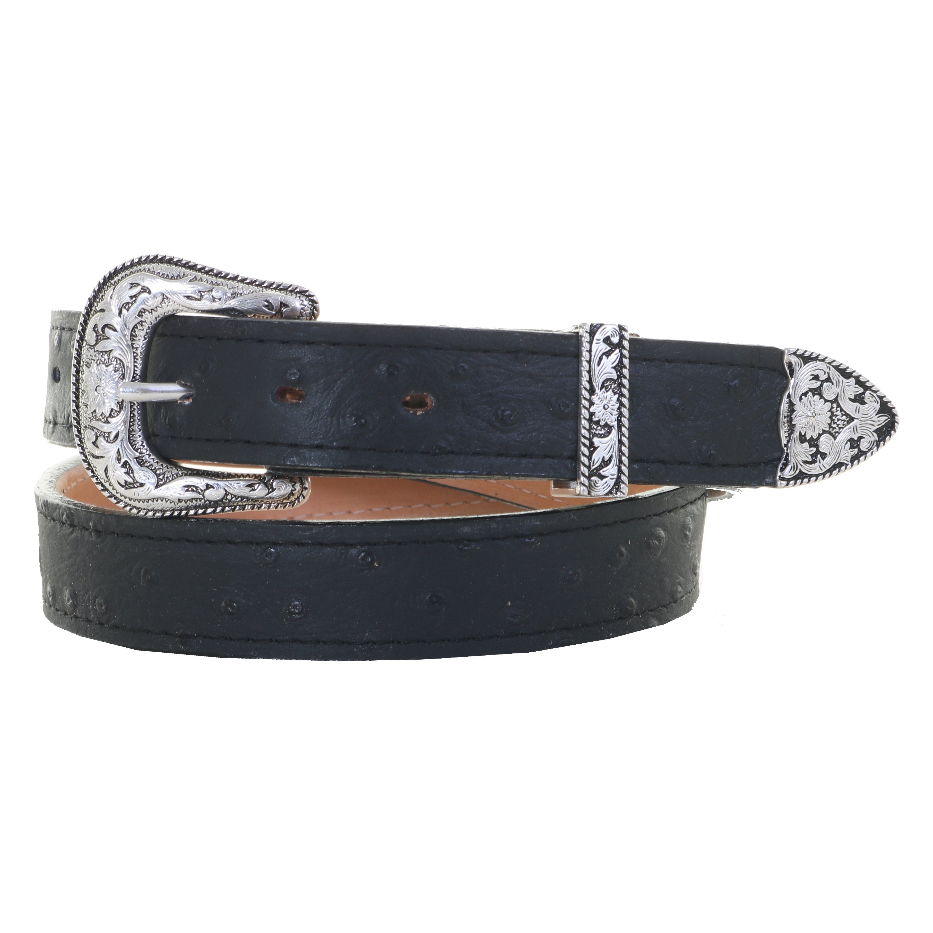 1 1/4" belt in black vintage ostrich print with antique silver floral leaf buckle set.