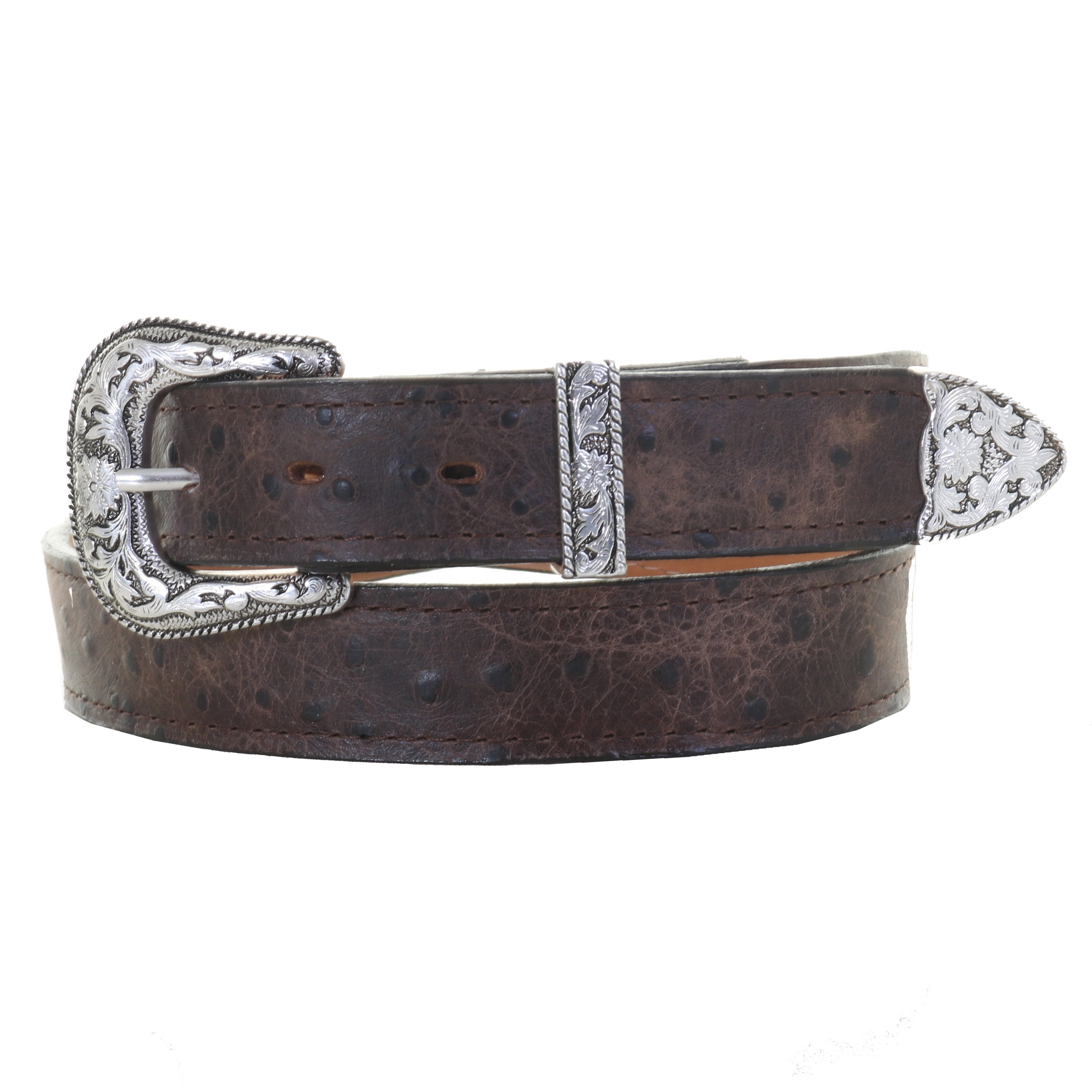 1 1/4" belt in chocolate vintage ostrich print leather with antique silver floral leaf buckle set.