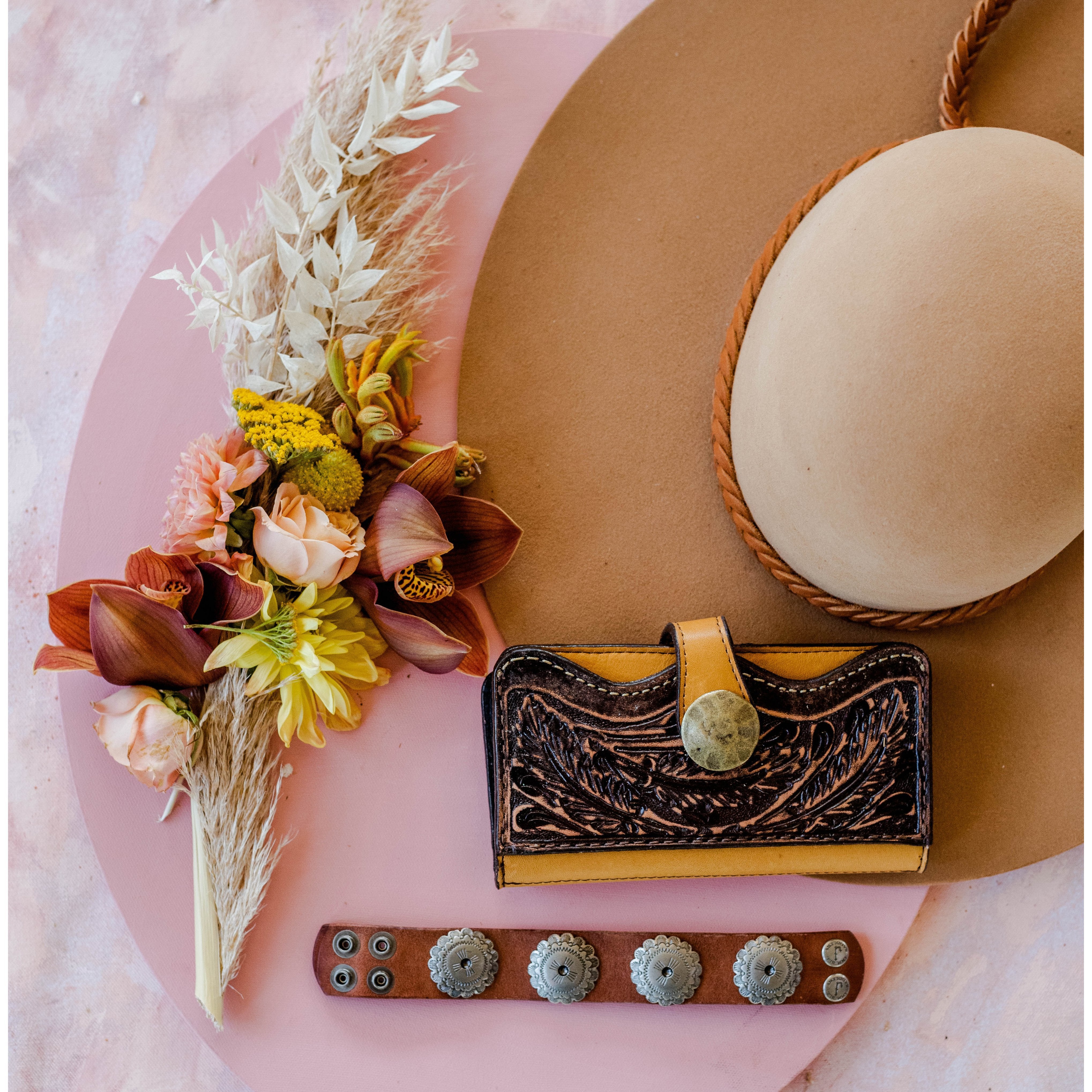 1 1/4" cuff in harness leather with antique silver southwest scalloped conchos.