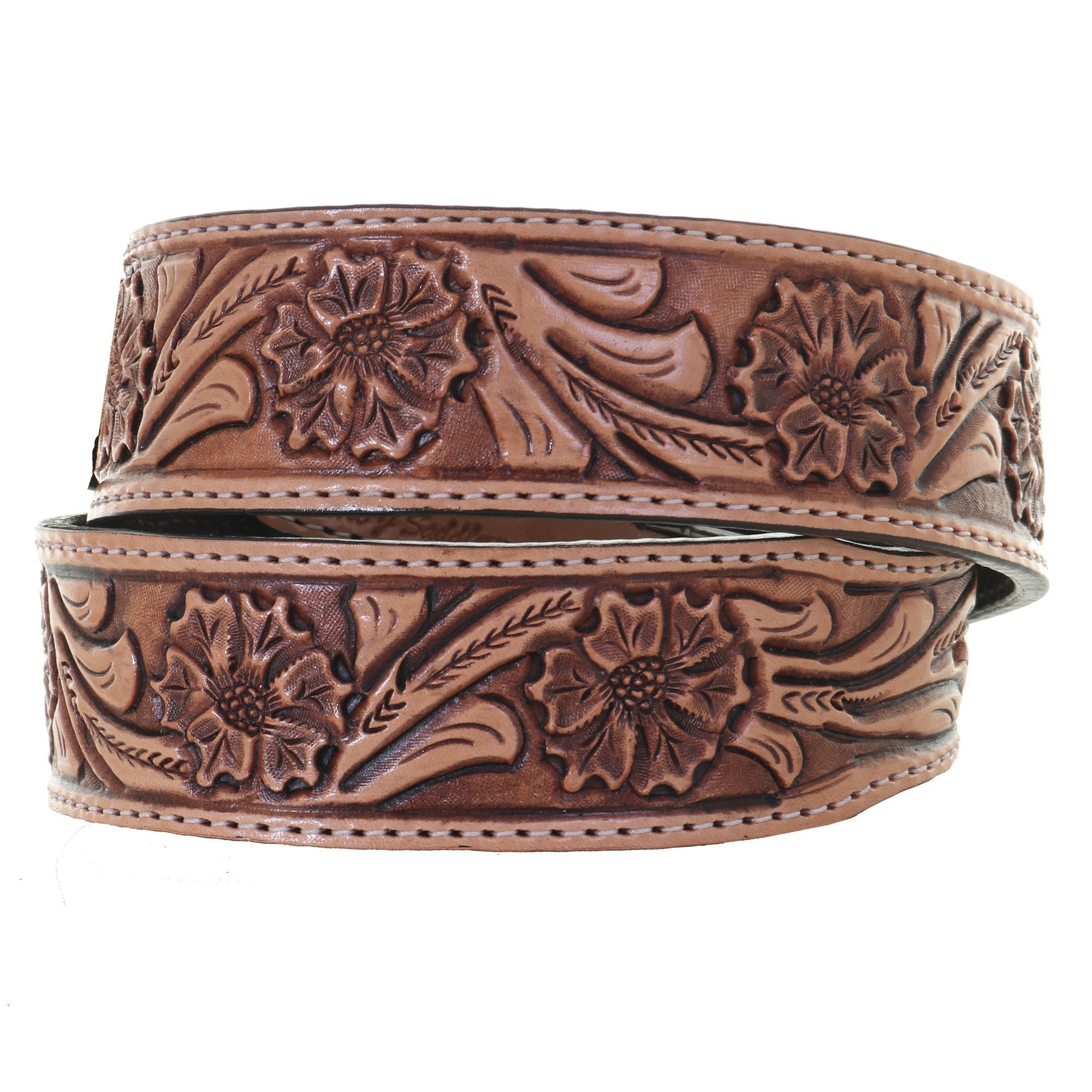 1-7/8" tapered to 1-1/2", skirting leather belt with small floral hand tooled pattern and antique finish. The back is leather lined and stitched.  Customized with your initials.  This belt is NOT returnable.