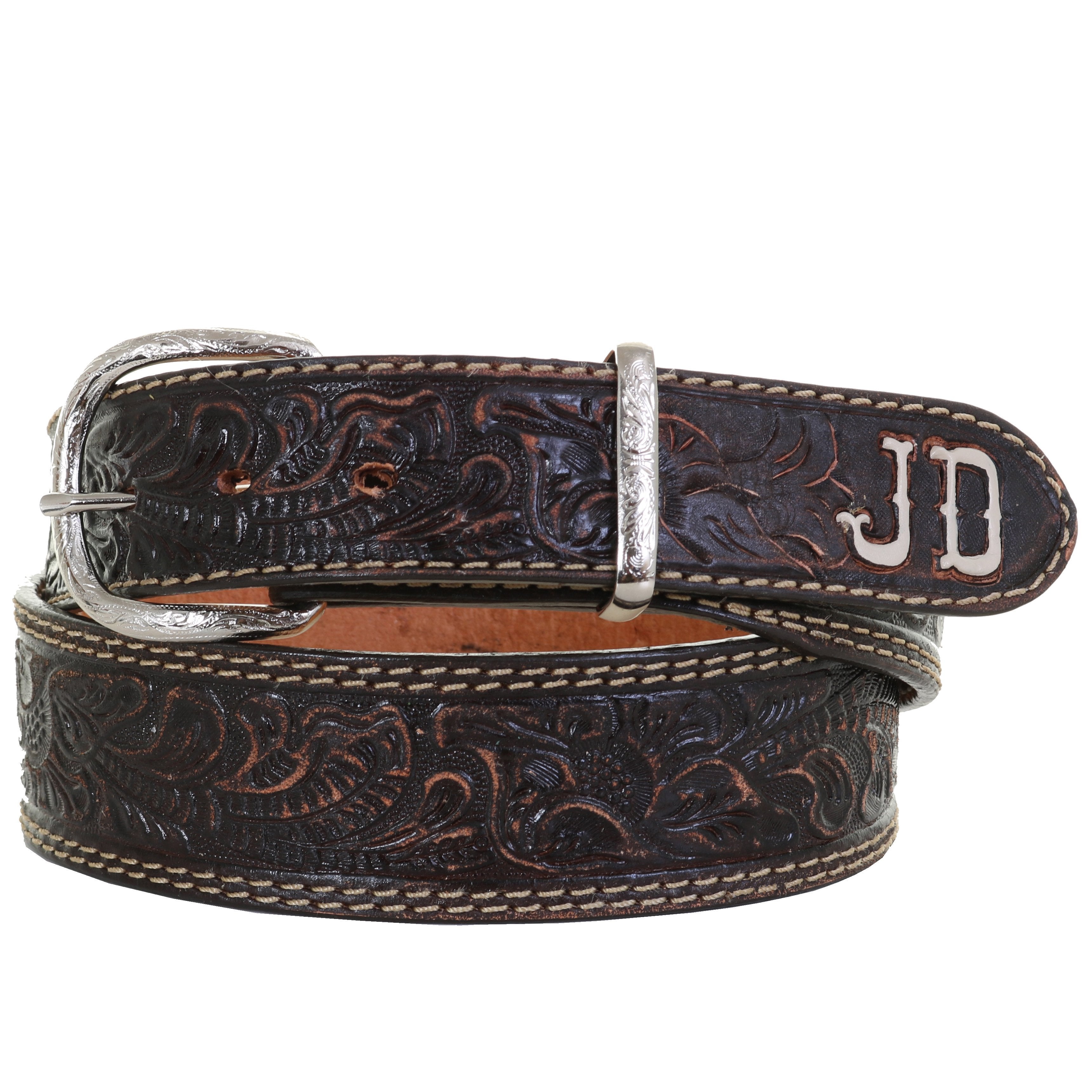 1 7/8" tapered to 1 1/2" brown vintage belt with floral tooling, double row custom color stitching, and matching custom initials. Shown in white with Thunderbird font. Second picture shown in cream. This belt is NOT returnable.
