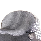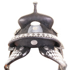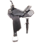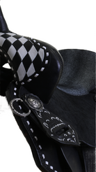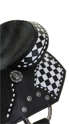 The SPL33 Double J Legend Barrel Racer saddle features black skirting with a spinal relief system for comfort. It showcases a black and white checkerboard tooling pattern with white buck stitching throughout. The seat is crafted from black javelina print leather, designed for durability and style. Equipped with a three-way rigging system, aluminum stirrups, and engraved horseshoe brand conchos, this saddle combines expert craftsmanship with functional design for barrel racing performance