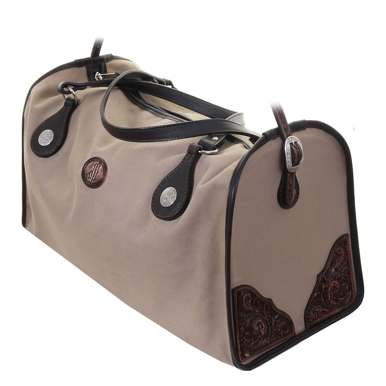 Khaki canvas duffel bag with brown zipper. Brown vintage tooled corner plates and strap ends. Silver etched conchos and matching buckles. Convenient double handles and long adjustable shoulder strap.