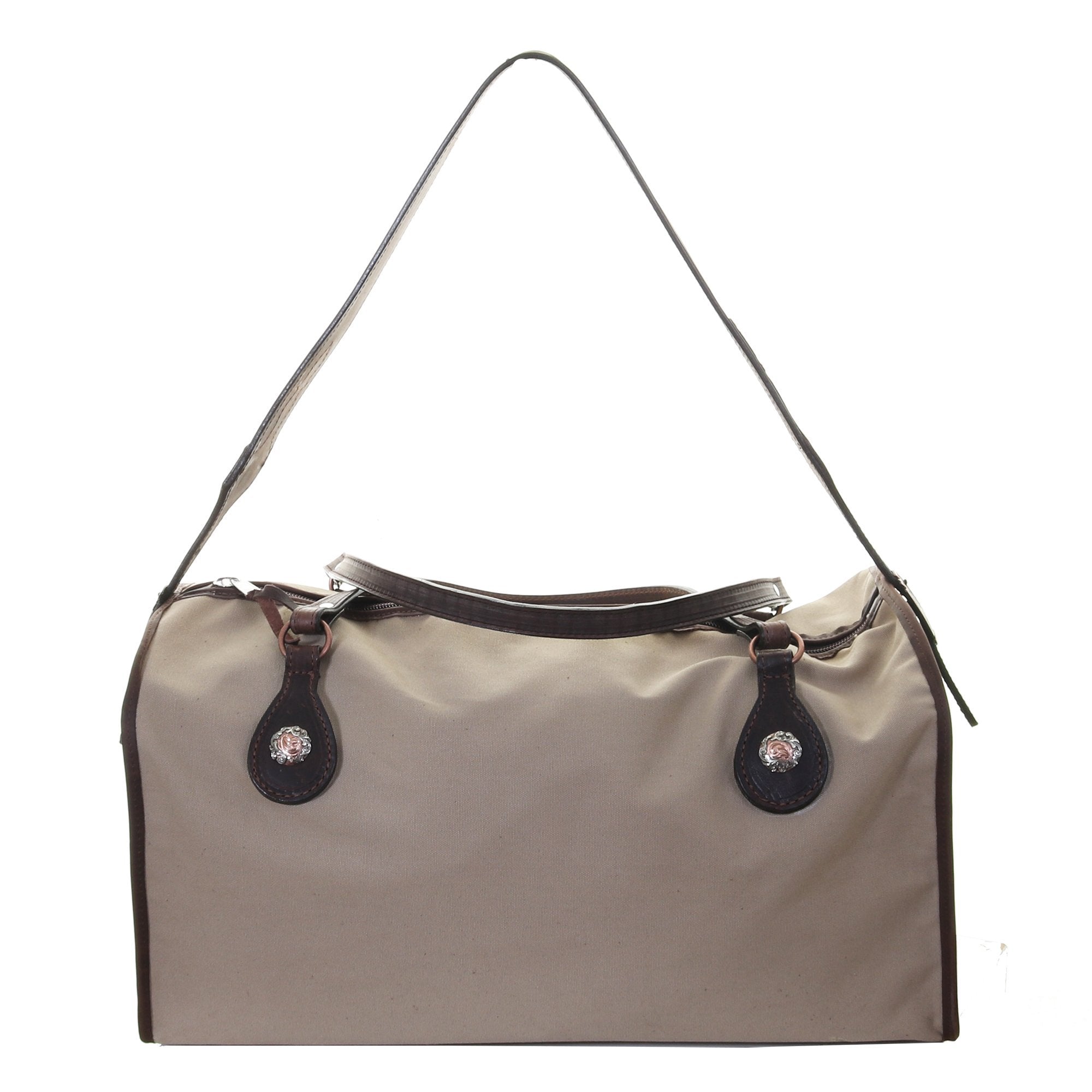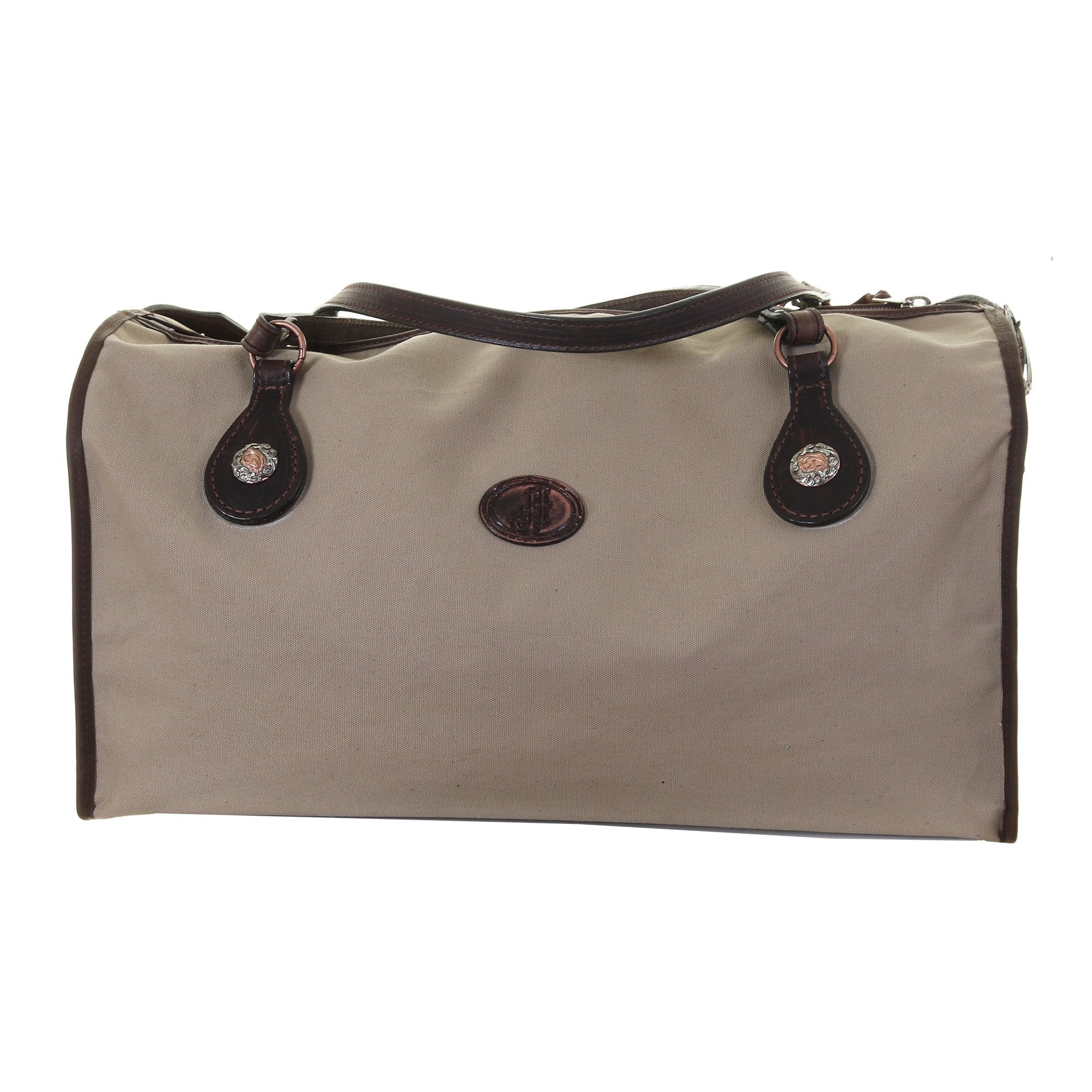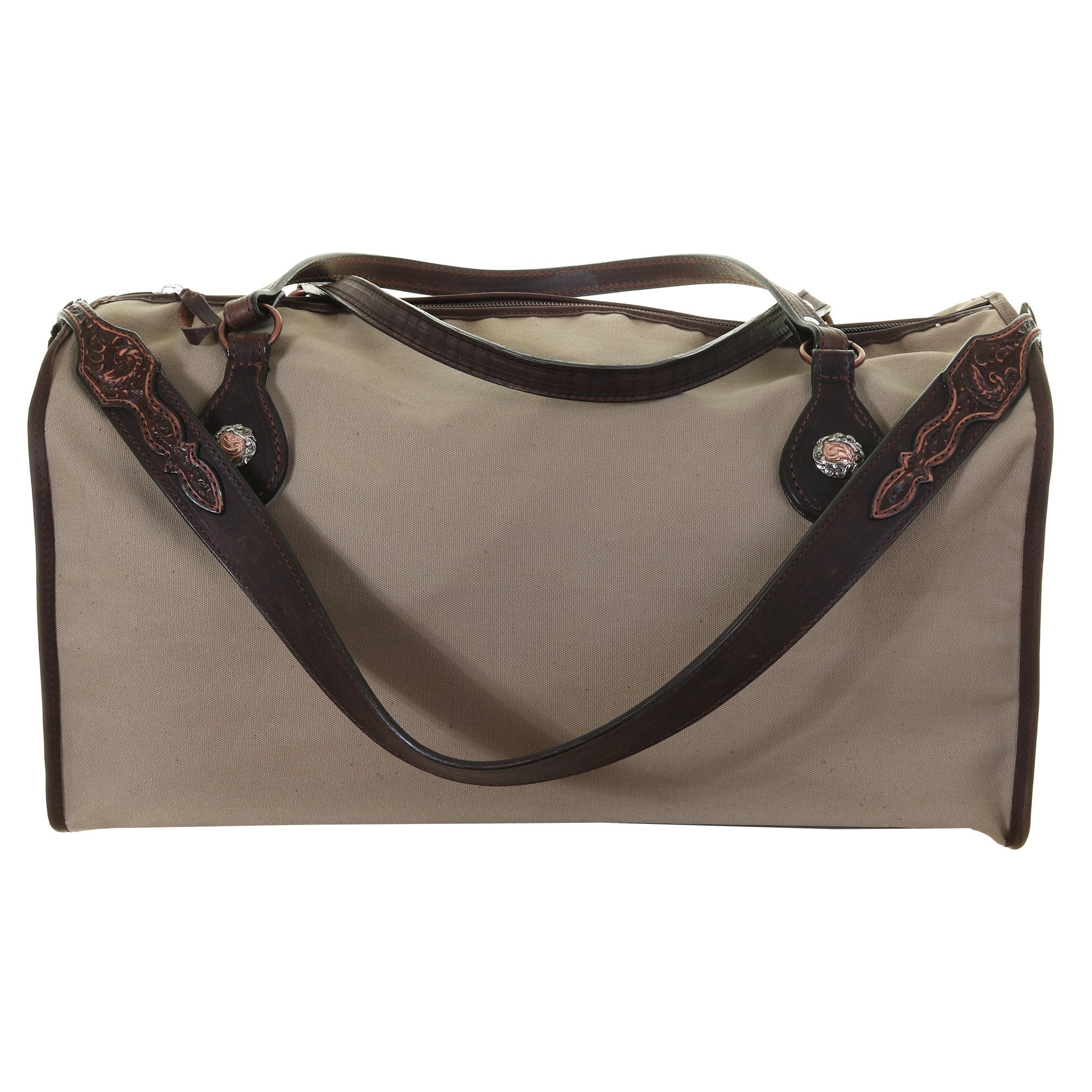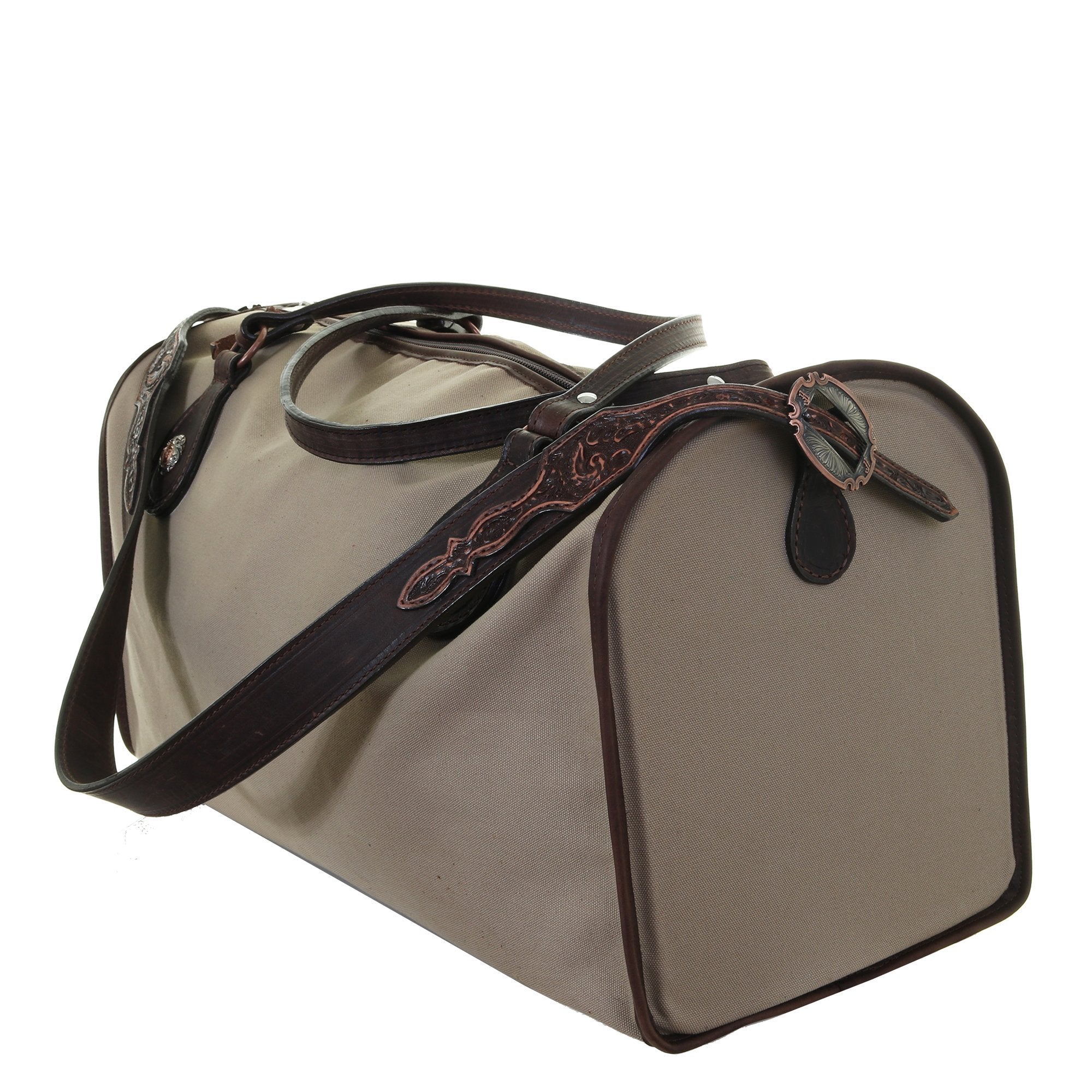 Khaki canvas duffel bag with brown zipper and chocolate pull up trim. Antique copper and silver scroll conchos and matching Double J buckles. Convenient double handles and a long adjustable shoulder strap with fancy tooled overlays.