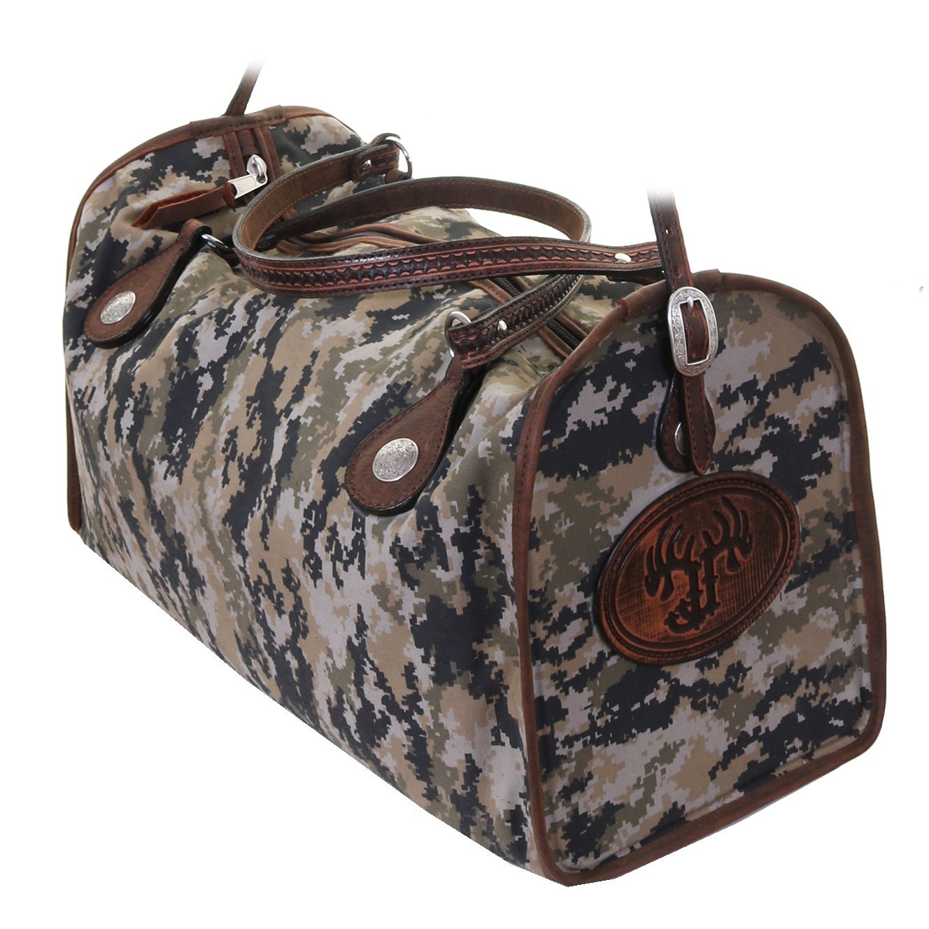 Digital camo canvas duffel bag with brown zipper and straps. Brown vintage tooled shoulder strap and oval antler plaque. Silver etched conchos and matching buckles. Convenient double handles and long adjustable shoulder strap.