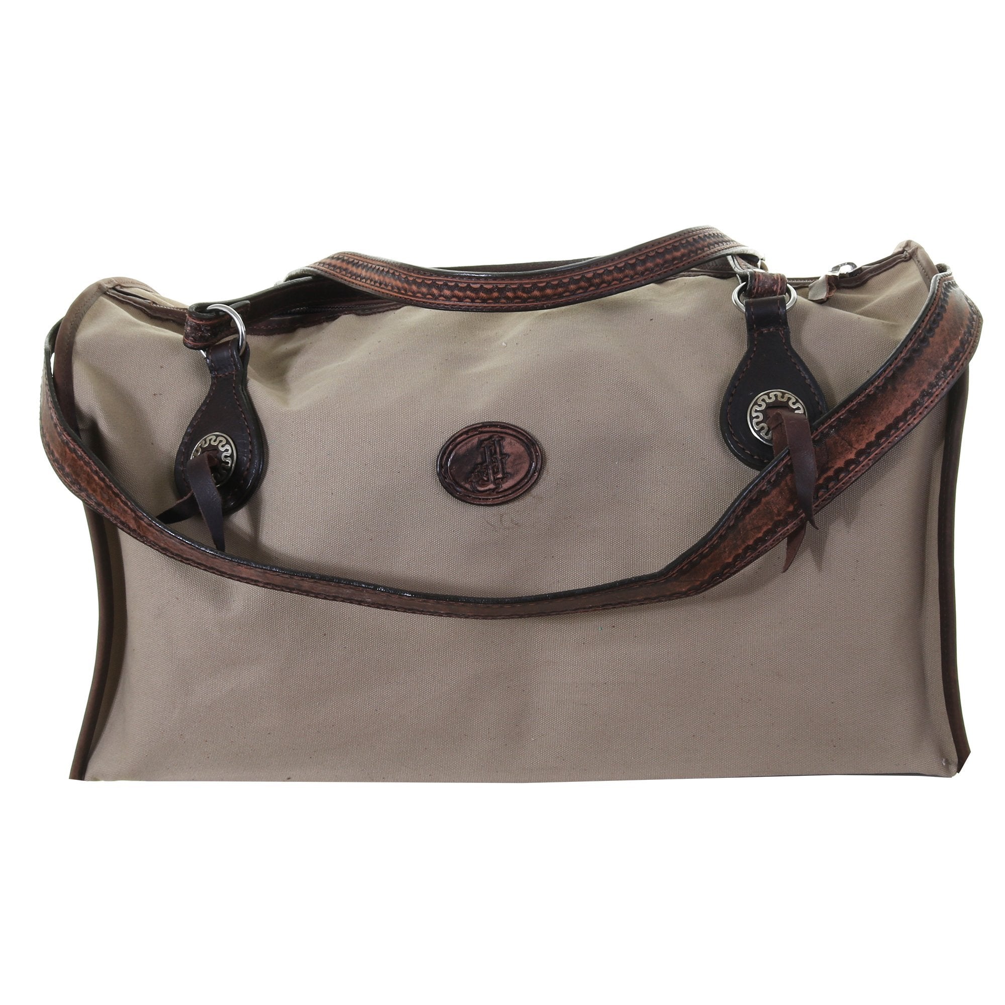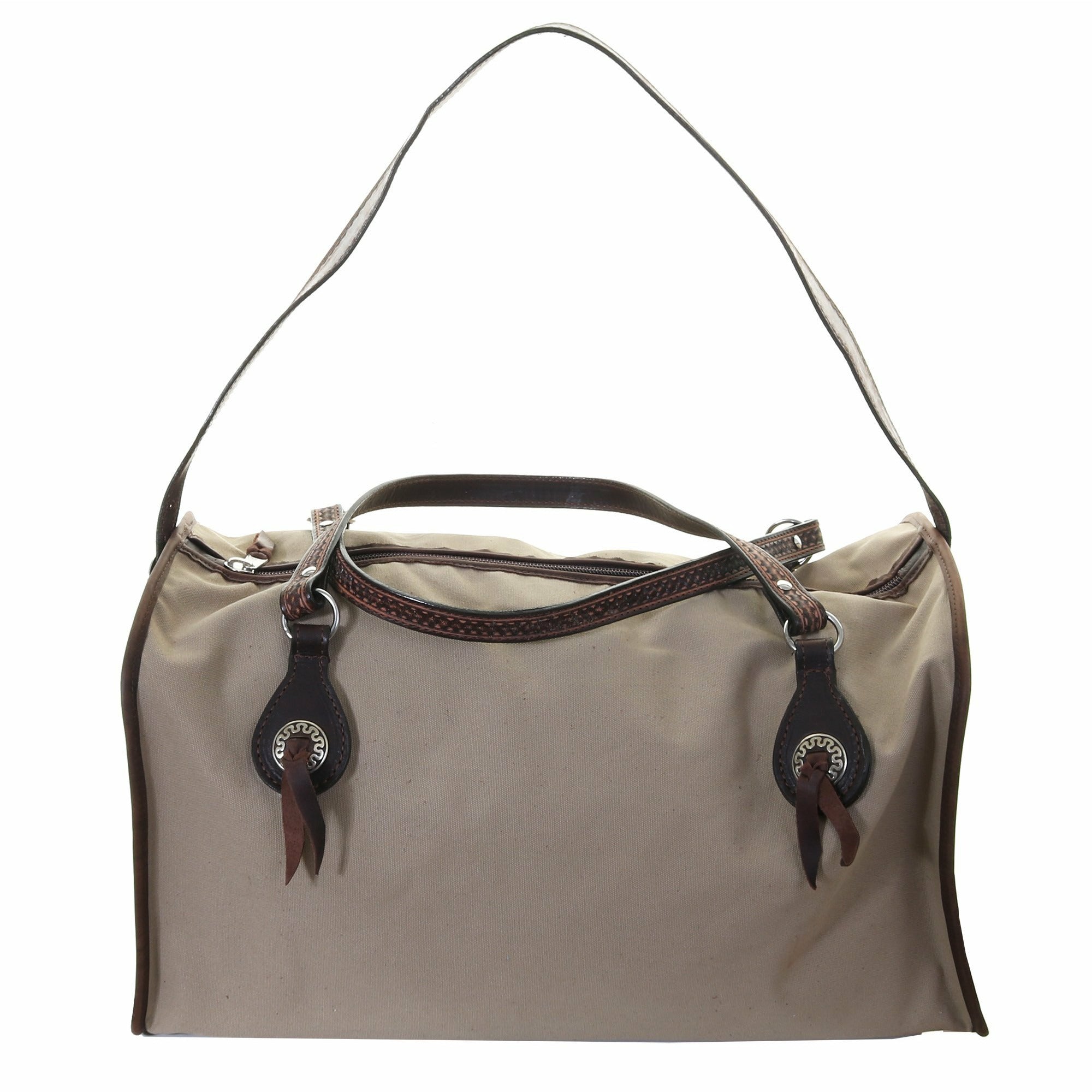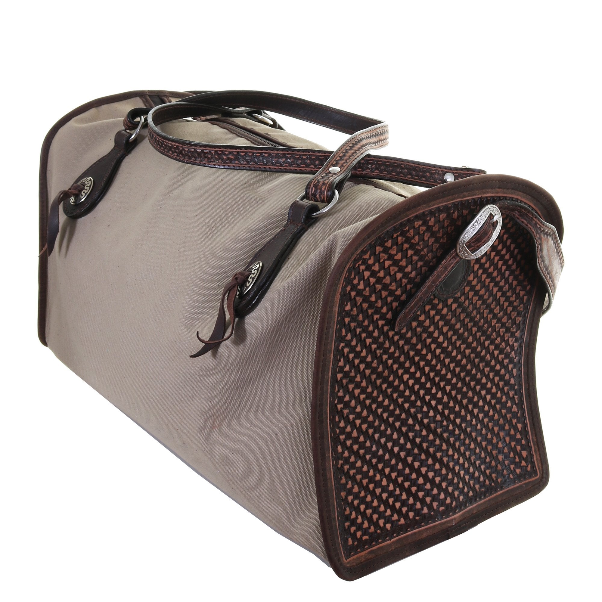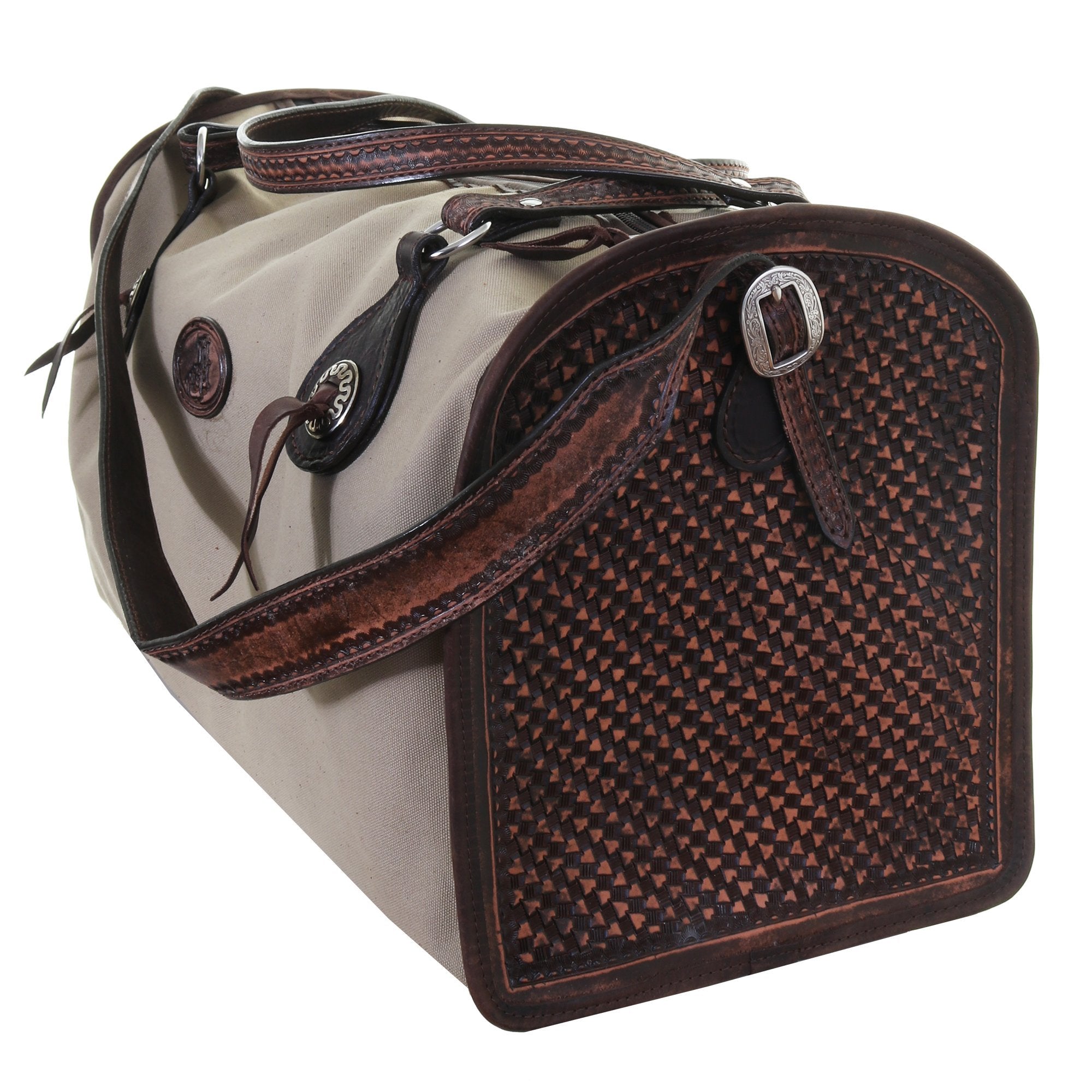 Khaki canvas duffel bag with brown zipper and chocolate pull up trim. Brown vintage with arrow basket weave tooled ends. I-beam rustic iron slotted conchos with laces and silver engraved buckles. Convenient brown vintage double handles and a long adjustable shoulder strap with ric rac tooling.