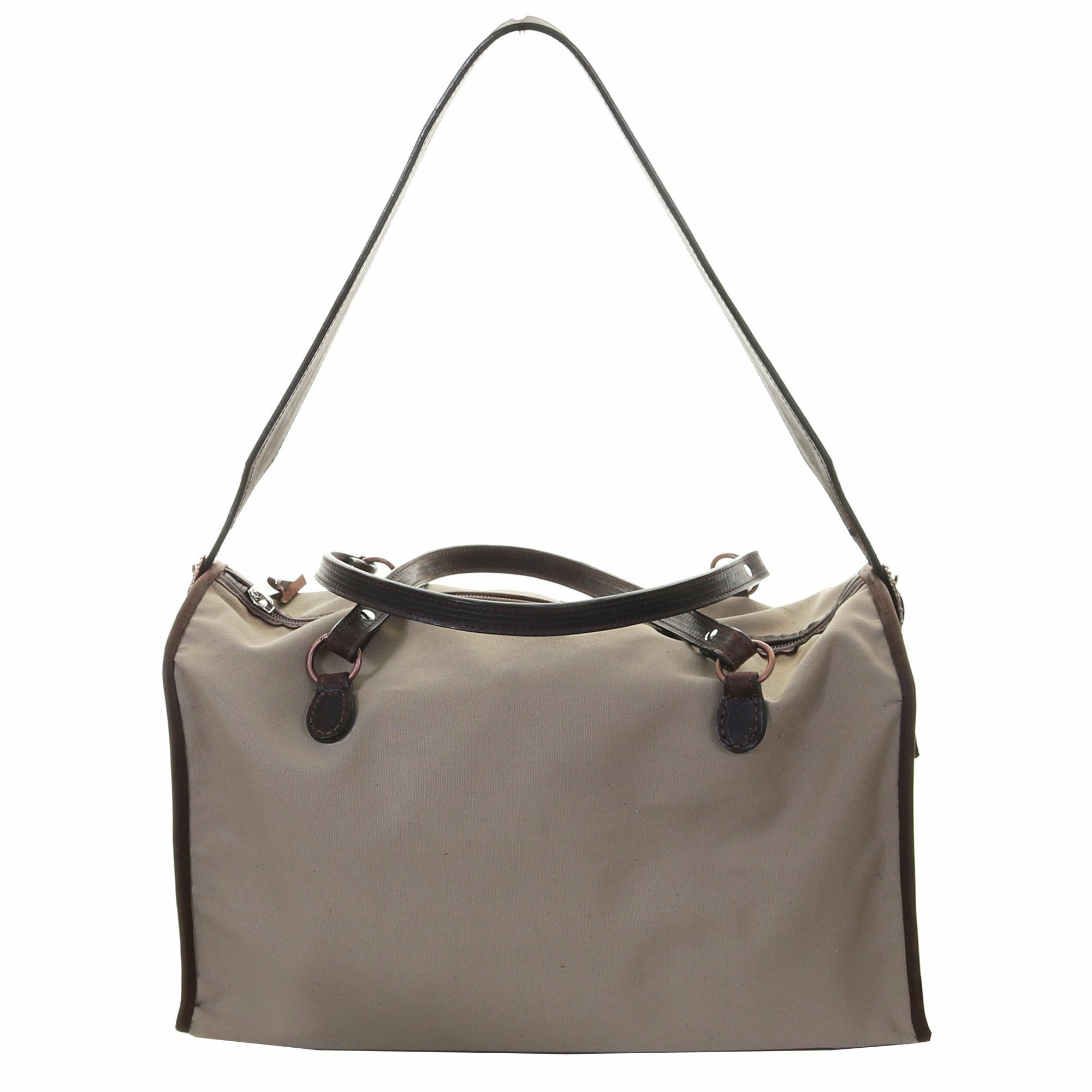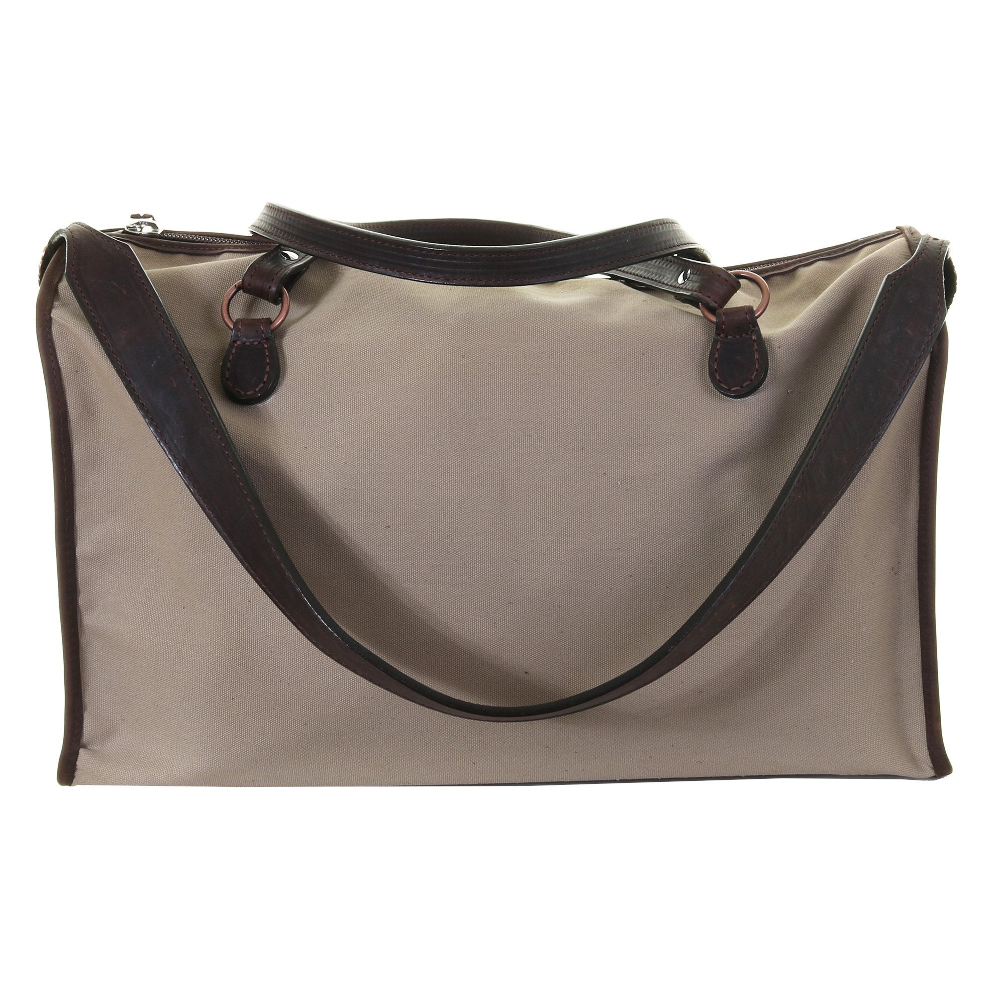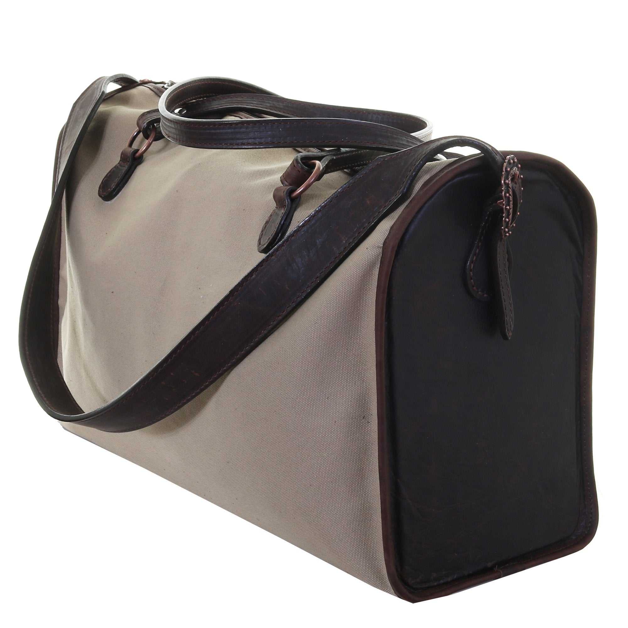 Khaki canvas medium duffel bag with brown zipper, chocolate pull up trim and sides. Convenient double handles and a long adjustable shoulder strap with antique copper berry buckles.