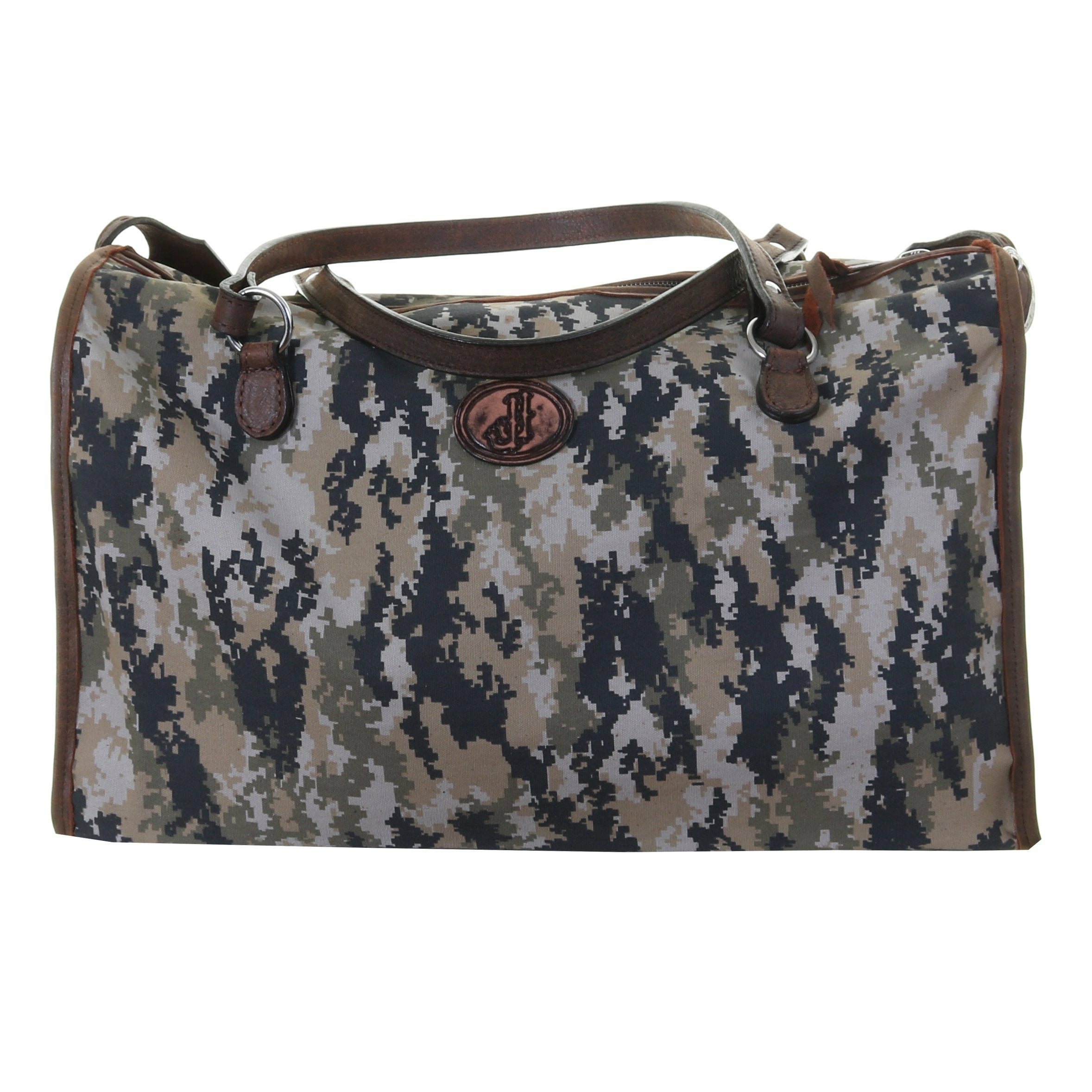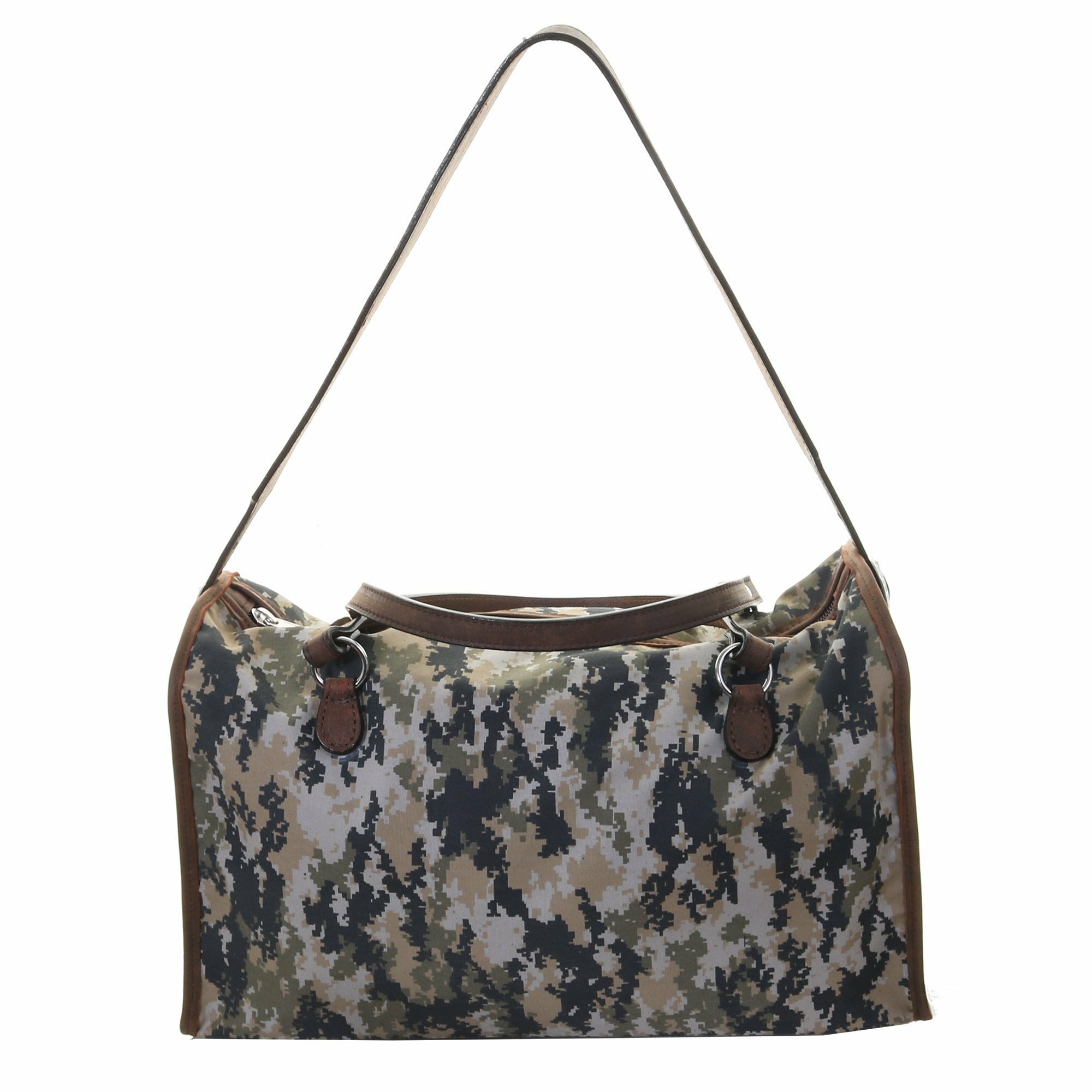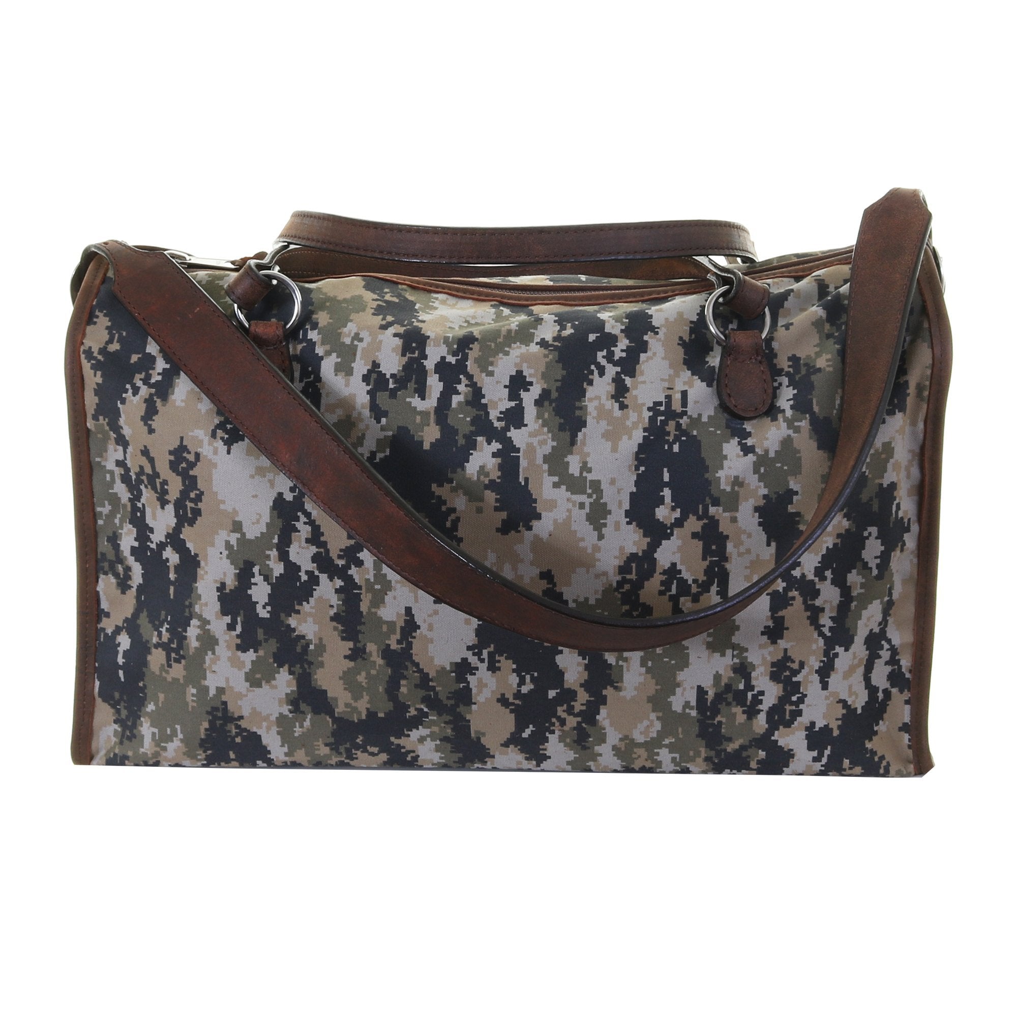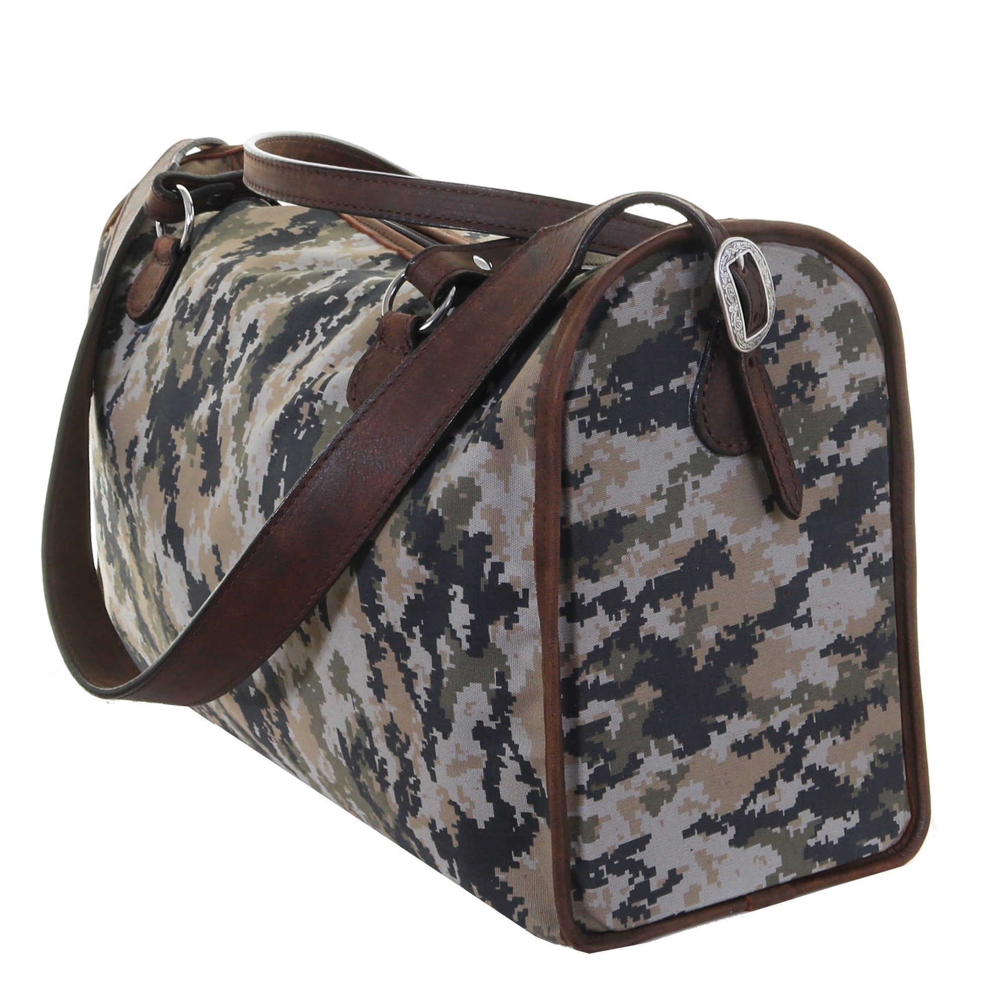 Digital canvas medium duffel bag with brown zipper, brown bomber trim. Convenient double handles and a long adjustable shoulder strap with silver engraved buckles.