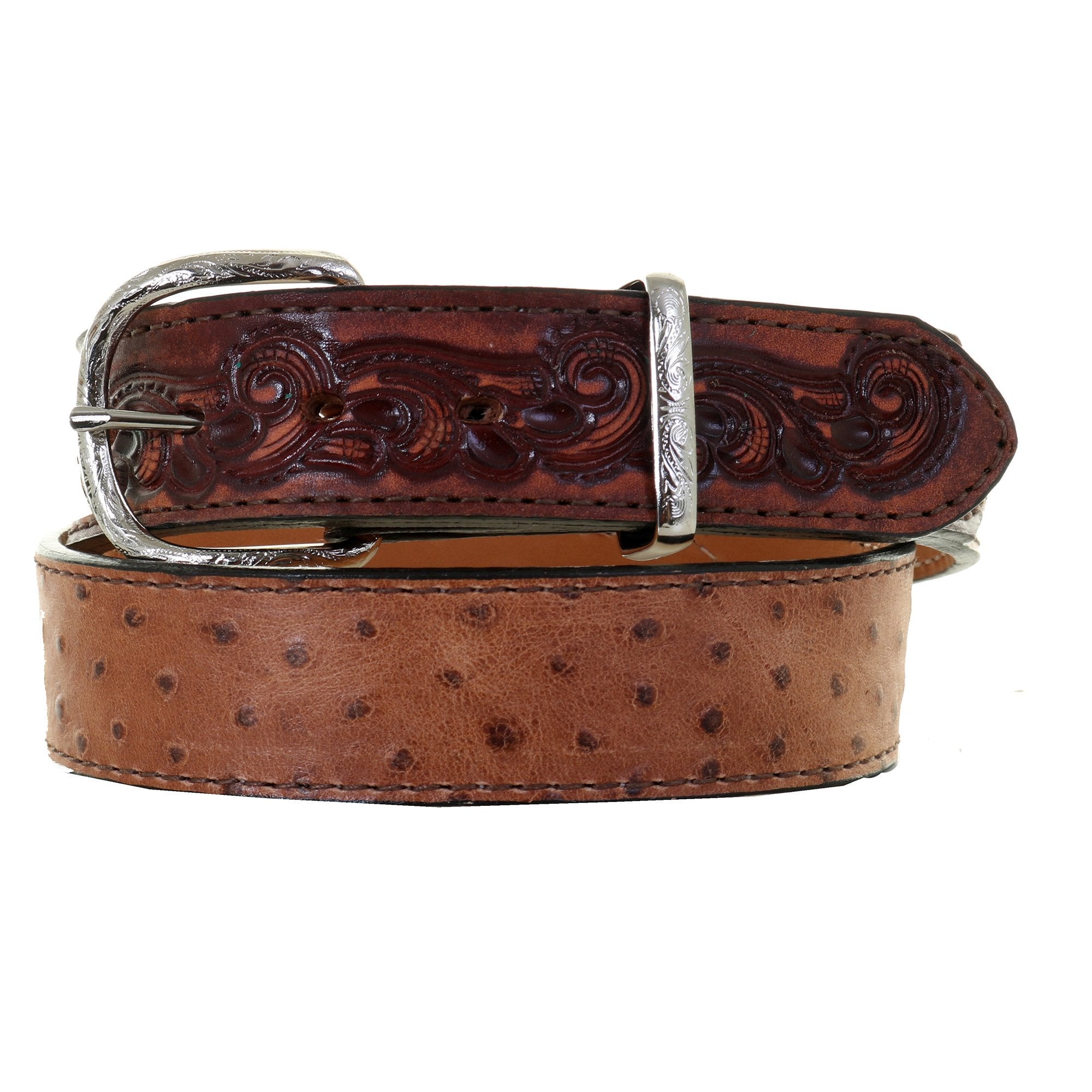 B1120 - Cognac Vintage Ostrich and Tooled Leather Belt