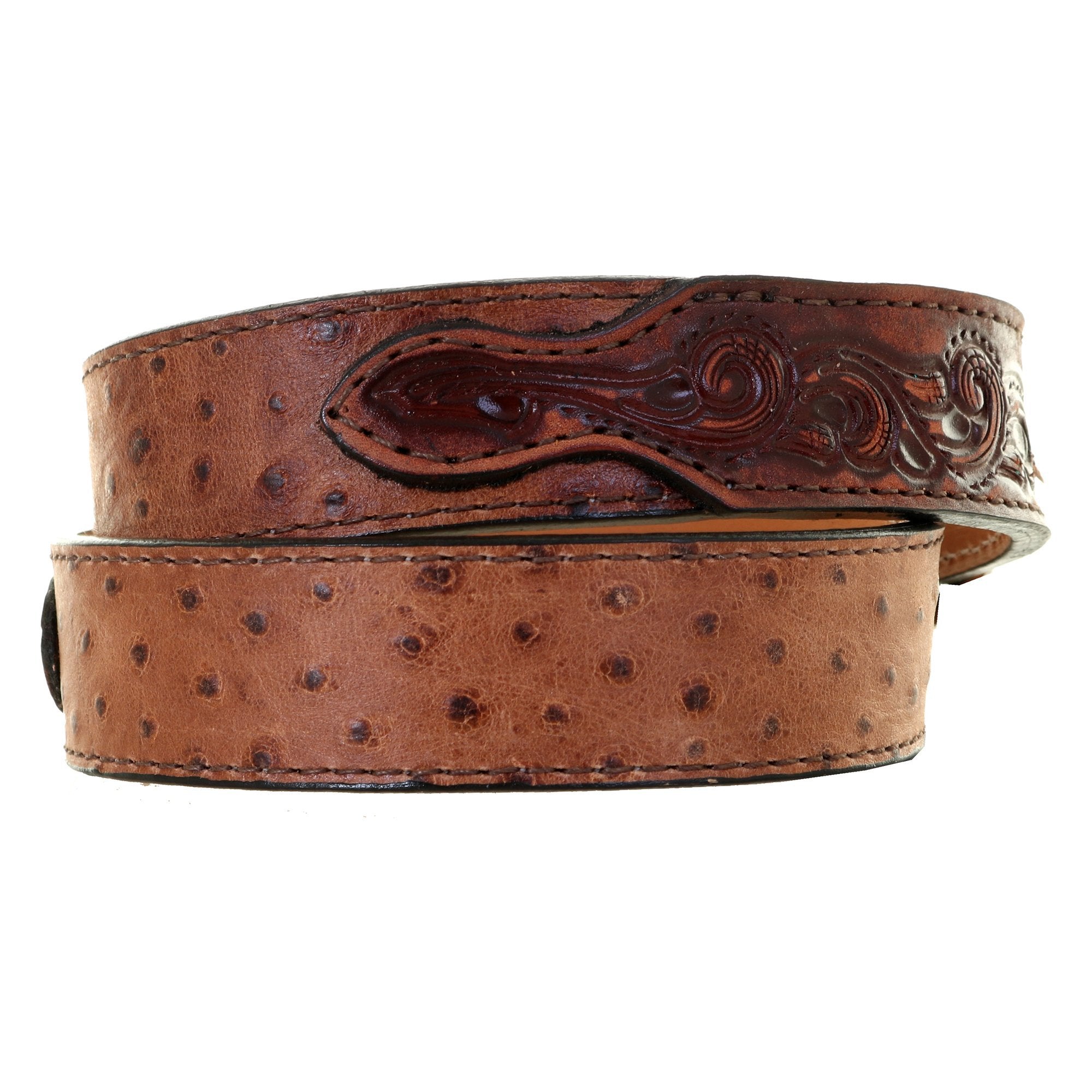 1 ½” belt in vintage cognac ostrich print with cognac vintage whirlwind teardrop billet ends