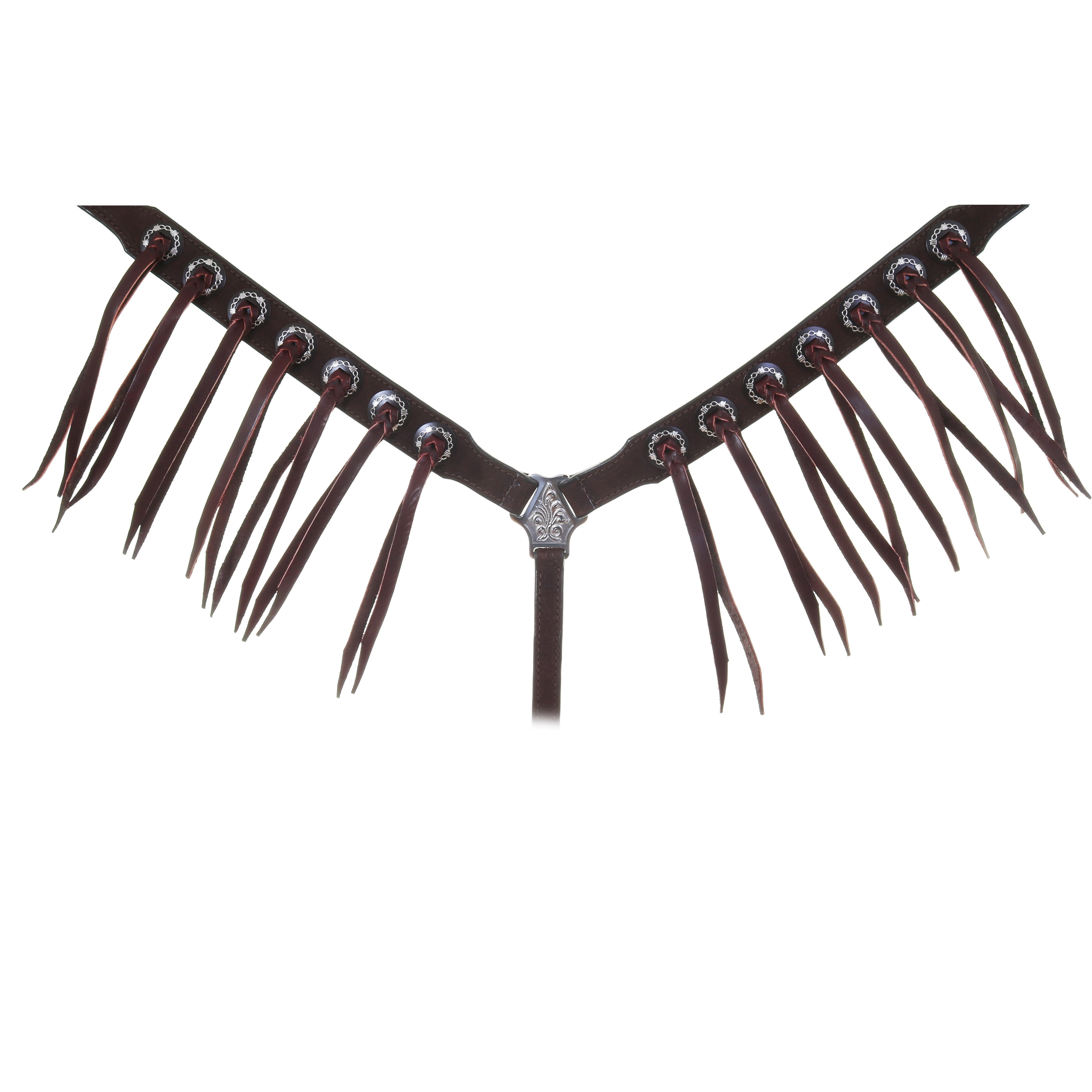 Brown rough out breast collar with center Y plate. Seven rustic barbwire slotted conchos with latigo laces on each side.