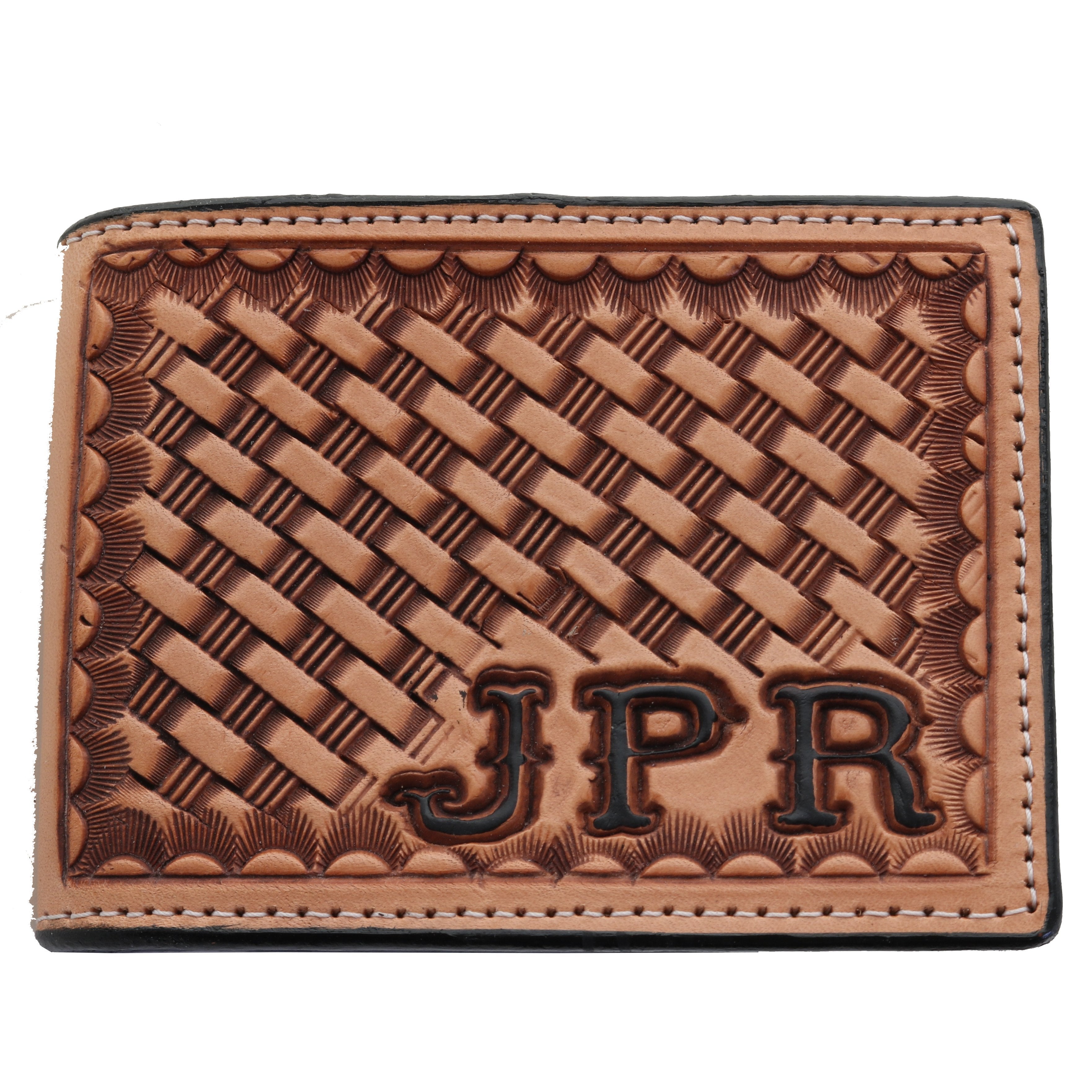 Men's bifold wallet with basket weave tooling on the front. Includes double sided picture window for driver's license or other I.D, 6 slots for credit cards, etc., 2 long dividers for cash, etc. Customize with your initials. Shown in Thunderbird font.