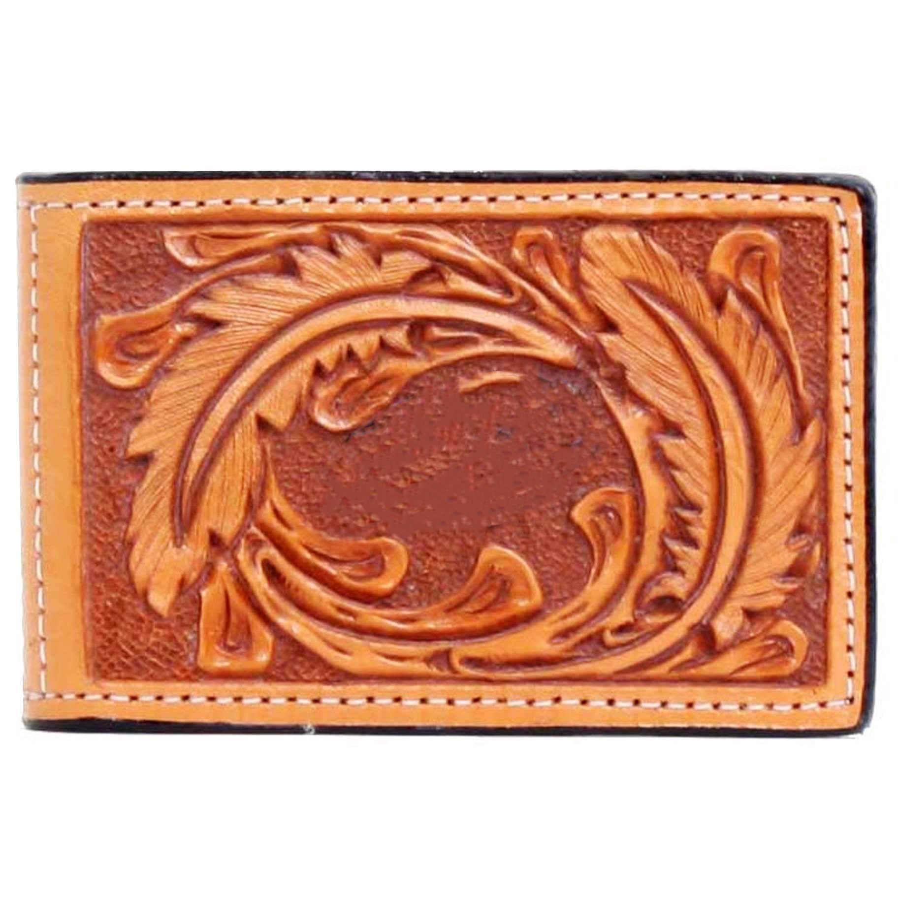 Customized natural leather money clip with feather tooling personalized with an initial in the center. Two pockets on the inside to hold credit cards, business card, etc. and a money clip to secure your cash.