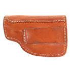 Gun holster made in harness leather with a clip holder on the front, and a leather loop on the back. Shown with a 22 caliber.