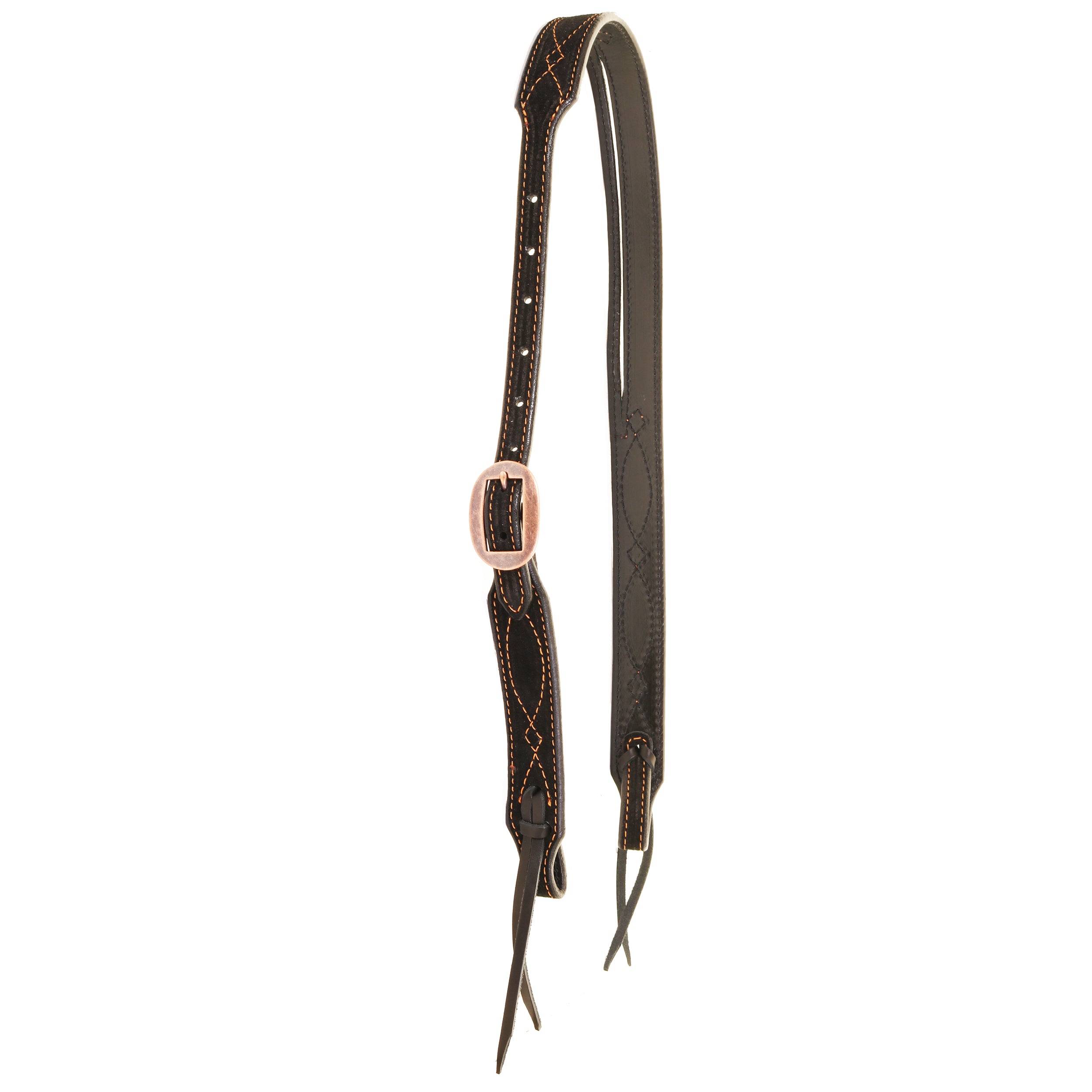 Black Suede Split Ear Headstall with Copper Gunslinger Stitching, Copper Buckles, and Black Laces at Bit Ends.